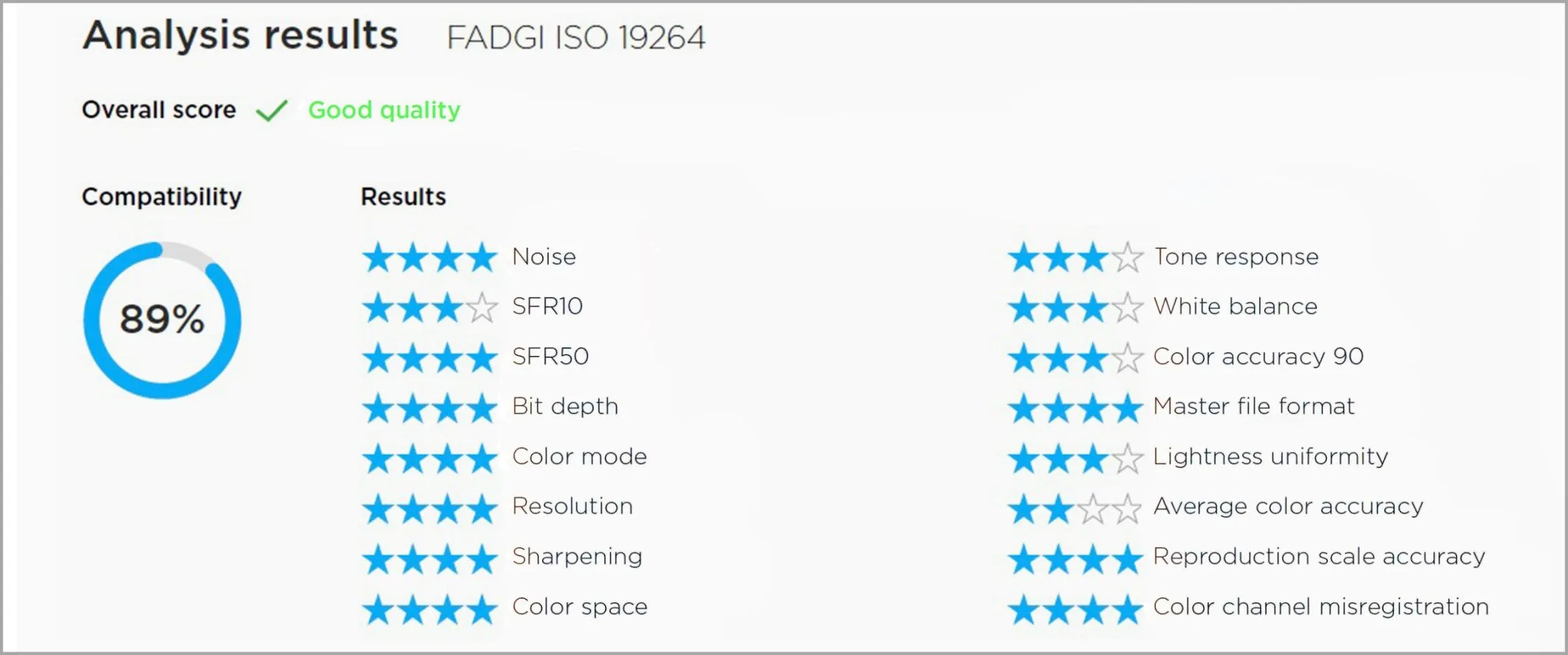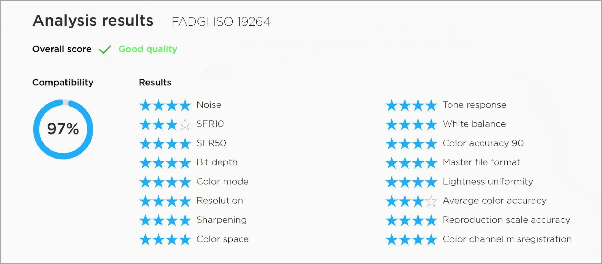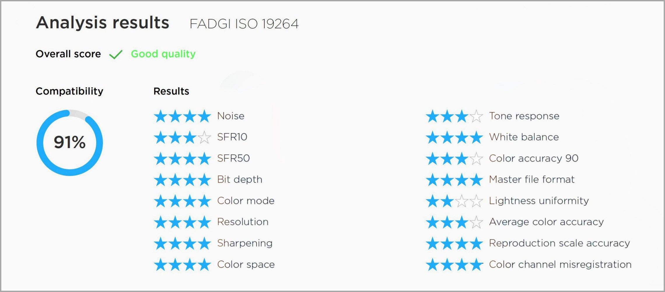 Um ein faires und vergleichbares Ergebnis zu erzielen, haben sie alle Systeme unter penibel kontrollierten Bedingungen getestet: Die Kameras wurden so positioniert, dass sie die Testcharts mit einer nativen Auflösung von 400 ppi erfassten, alle Objektive wurden auf Blende f/11 eingestellt und die ISO-Empfindlichkeit auf den Basiswert 100 fixiert. Die Auswertung der resultierenden TIFF-Dateien übernahm die spezialisierte Software NimbusQ∆ von Phase One, die ein Bild anhand von 16 Qualitätskategorien analysiert und einen FADGI-Konformitätswert in Prozent ausgibt.
