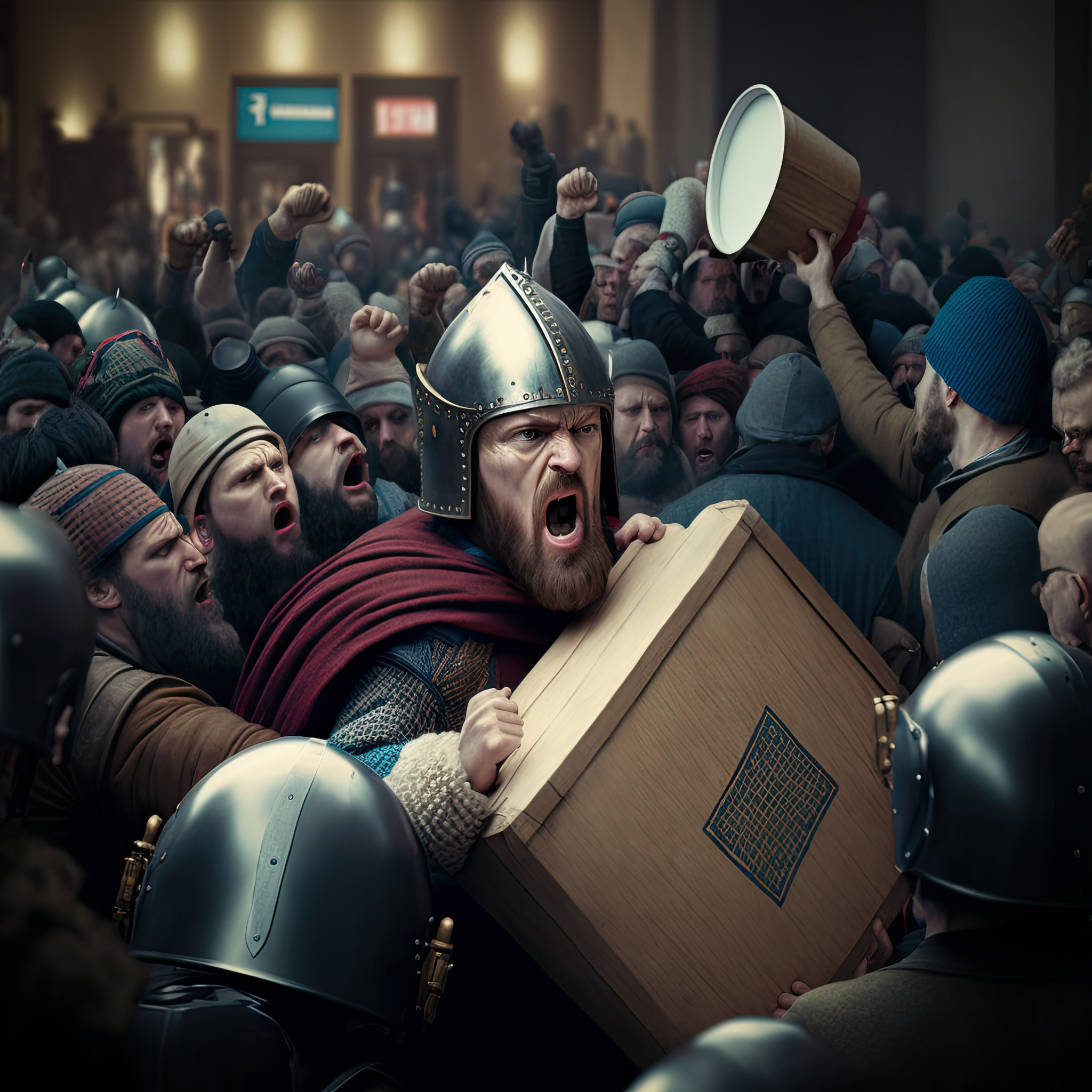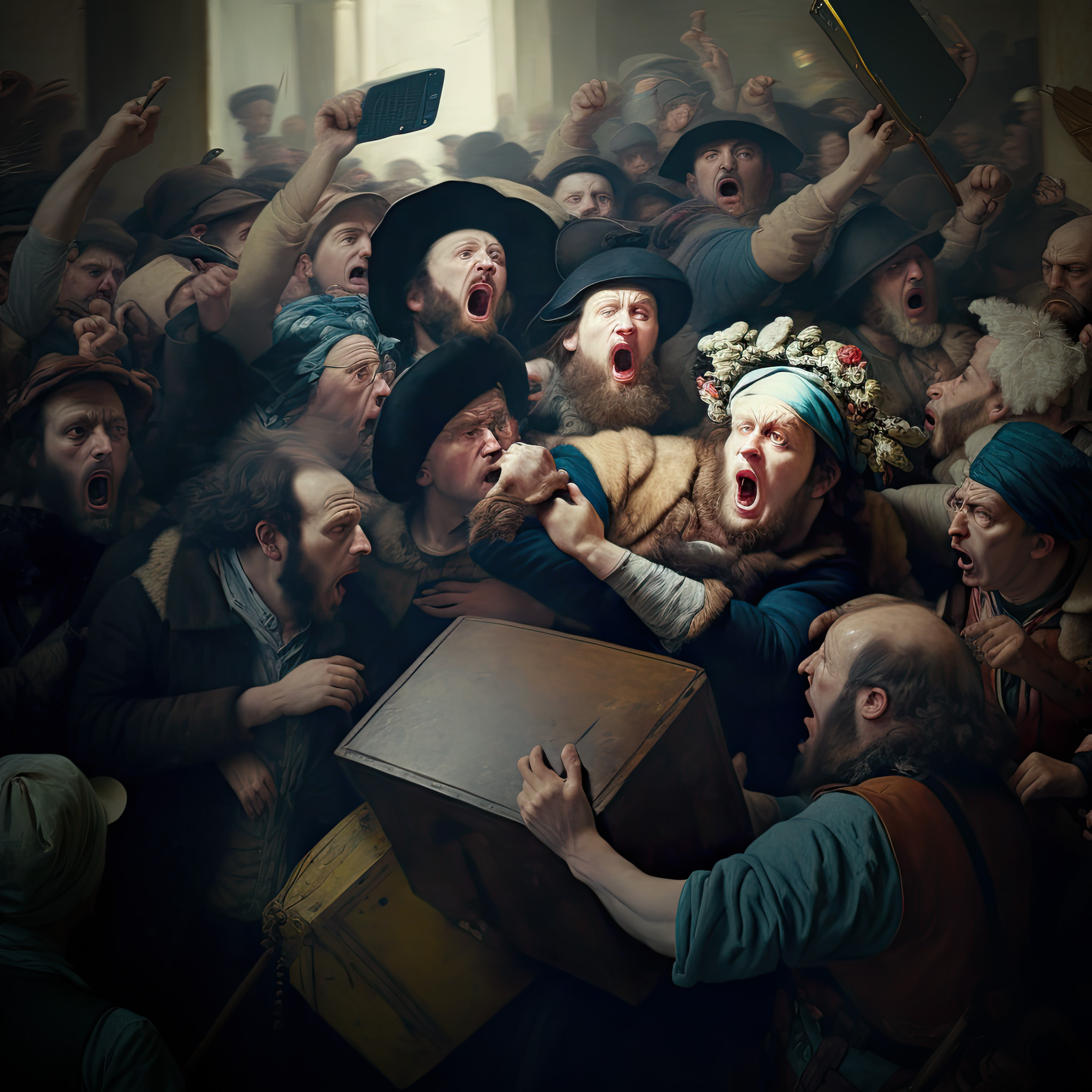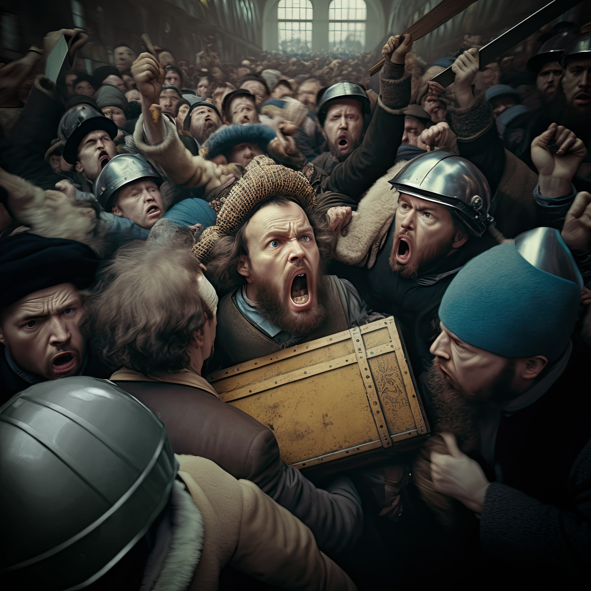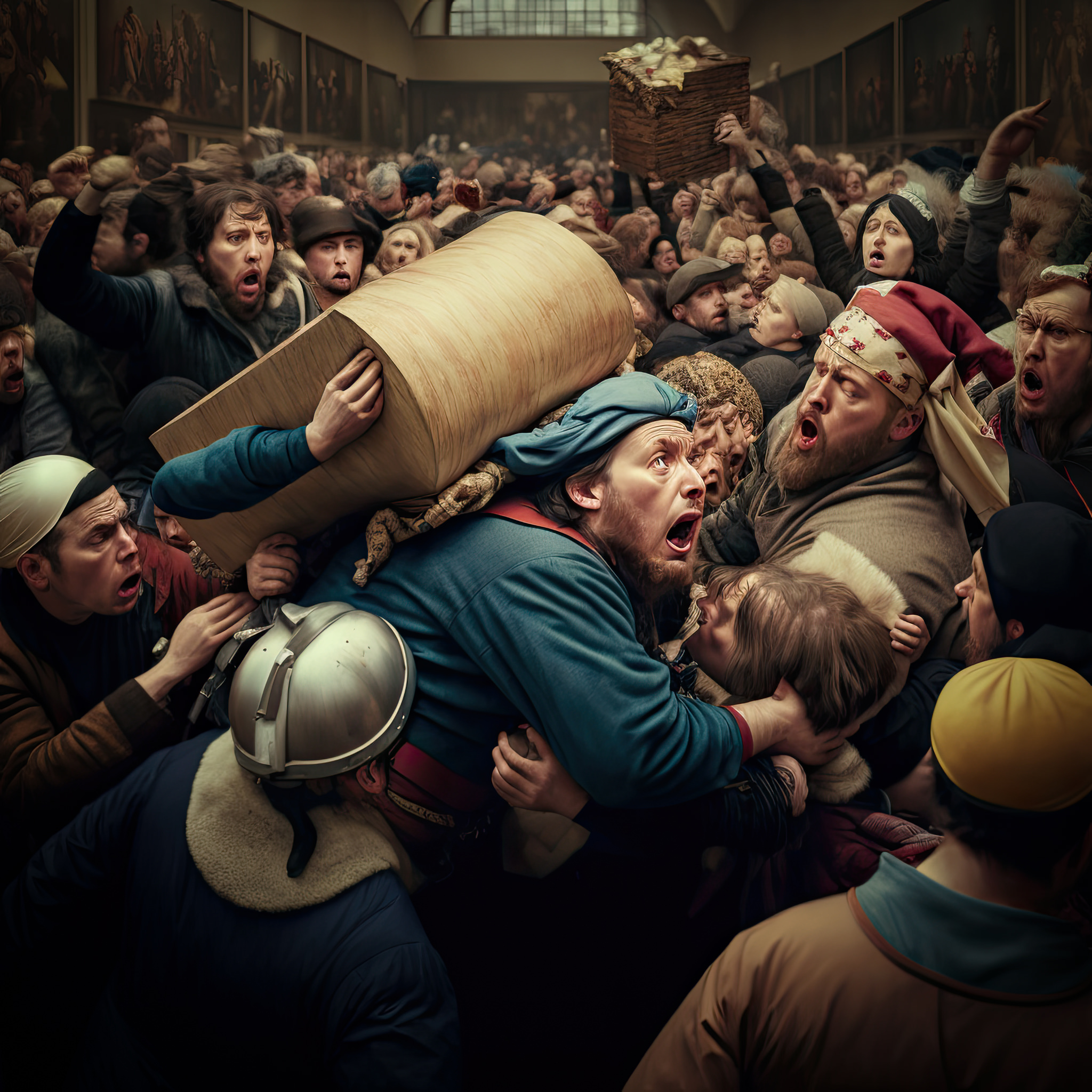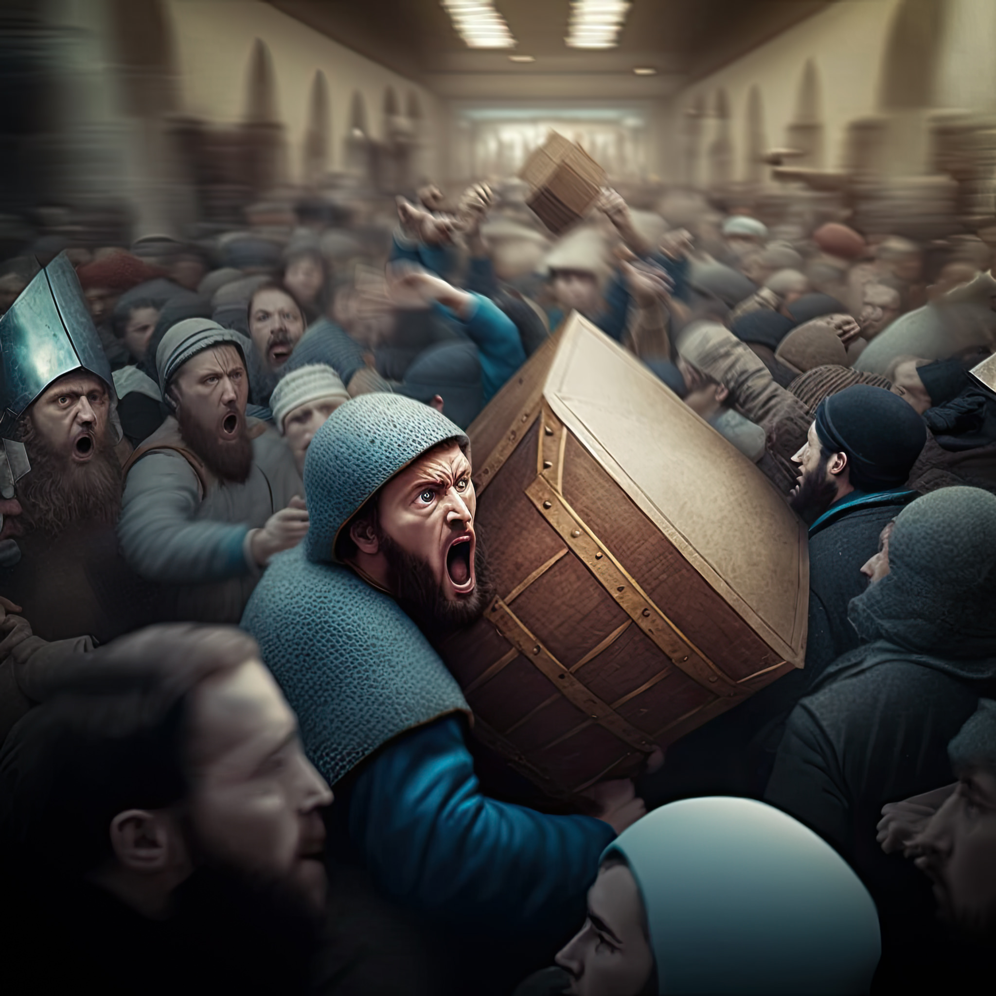Für Mittelalter-Fans. Auch die Idee eines Black-Friday-Sales im Mittelalter wollte ich mit 3D umsetzen, bin dann aber beim Rigging der Personen und deren Gesichtsausdrücken gescheitert. Da hätte ich das gleich alles in Photoshop malen müssen. Die KI-Ergebnisse sind aber schon vorzeigbar. Die kleinen und verkorksten Hände habe ich zum Teil belassen, weil die hier auch auf lustige Weise zu der Szene passten.