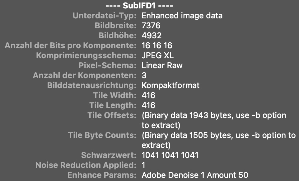 Nachdem der Speicherbedarf auf ein akzeptables Maß reduziert war, wollte Adobe auf die zweite (DNG-) Datei verzichten und die Verbesserung zusammen mit der originalen Raw-Datei speichern, womit sie den gewohnten, einfacheren Workflow wiederhergestellt hätten. Aber wo sollten die beim KI-Demosaicing gewonnen Daten bleiben? Zunächst einmal im Katalog, in dem alle Entwicklungsdaten eingetragen werden. Der Katalog im engeren Sinne ist eine Datei mit der Endung „lrcat“; das ist eine SQLite-Datenbank, die die aus den Bilddateien ausgelesenen Exif- und IPTC-Metadaten enthält, die von Lightroom selbst erzeugten Metadaten wie Schlagwörter und Bewertungen, und natürlich die eigentlichen Entwicklungseinstellungen.