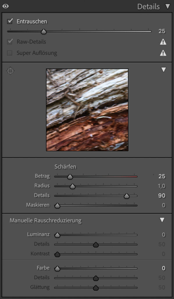 Die KI-gestützten Funktionen waren damit zwar nicht schneller geworden und ließen sich noch immer nicht in die Kette der Verarbeitungsstationen integrieren, aber da man nur noch mit der originalen Raw-Datei arbeitete, wurde der Menübefehl »Verbessern« überflüssig. Das KI-basierte Demosaicing, Entrauschen und Skalieren wurden dafür als weitere Optionen dem Bedienfeld »Details« hinzugefügt. Wählte man eine von ihnen aus, musste man warten, bis die KI ihren Job erledigt hatte, aber die Stärke des Entrauschens ließ sich danach noch ändern, und da die eigentliche Arbeit ja schon getan war, sah man im Vorschaubild sofort, was das bewirkte. Die KI-Funktionen konnten auch in das Kopieren und Einsetzen von Entwicklungseinstellungen einbezogen werden. Fügte man sie bei einer größeren Zahl weiterer Bilder ein, nahm es längere Zeit in Anspruch, jedes der Bilder individuell mit der KI zu bearbeiten, aber wenigstens musste man dabei nicht zuschauen, sondern konnte einen Kaffee trinken gehen. Vor Version 14.4 hätte man das Entrauschen jeder Datei einzeln anstoßen müssen.