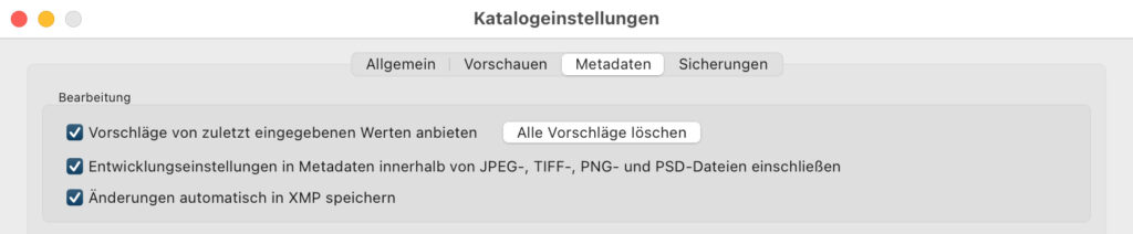 Schaltet man in den Katalogeinstellungen die Option ein, automatisch auch XMP-Daten zu speichern, werden dieselben Metadaten auch in einem Textformat gespeichert, entweder – wenn es um eine Raw-Datei im DNG-Format geht – in der Raw-Datei selbst, ansonsten in einer Sidecar-Datei mit demselben Namen, aber der Endung „XMP“. Diese redundante Speicherung ist nicht zwingend nötig, aber sie bietet unter anderem den Vorteil, dass man bearbeitete Raw-Dateien mitsamt aller Entwicklungseinstellungen, Schlagwörtern etc. auf einen anderen Computer übertragen kann – man muss dazu nur neben der Raw-Datei die XMP-Datei kopieren. Die zur Verbesserung nötigen Daten ließen die XMP-Dateien seit Version 14.4 anschwellen, von den gewohnten wenigen Kilobyte auf mehrere Megabyte. Dasselbe passierte mit der lrcat-Datei des Katalogs, in der ja dieselben Daten – nur in anderer Form – gespeichert waren.
