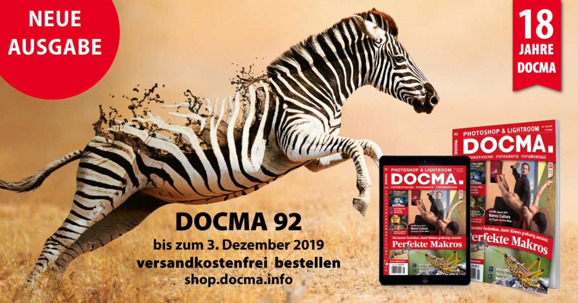 Ab sofort können Sie die druckfrische neue DOCMA 92 versandkostenfrei bei uns im DOCMAshop vorbestellen. Einfach in den Warenkorb legen – Versandkosten werden nicht berechnet. Das „Early-Bird“-Angebot gilt aber nur für den Vorverkauf bis zum 3. Dezember 2019. Ab dem 4. Dezember 2019 ist das Heft lieferbar und am Kiosk erhältlich. Wer ein DOCMA-Kombi-Abo besitzt, findet das ePaper ebenfalls ab dem 4. Dezember in seiner DOCMA-App.
