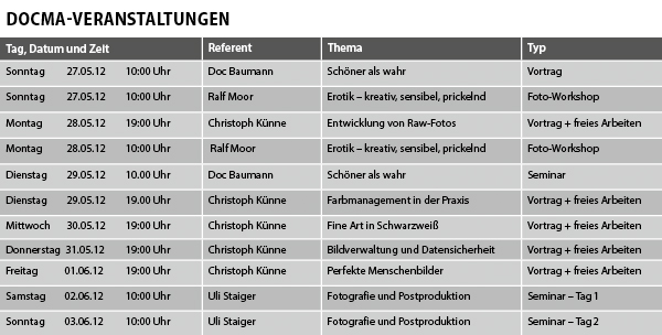 Fotoschule Zingst Mit 70 Seminaren trägt die Fotoschule Zingst dazu bei, den In­formationsbedürfnissen der Besucher auf allen Anspruch-Niveaus gerecht zu werden. Das Spektrum reicht von Akt-Fotografie bis zu Landschaftsaufnahmen mit Zeesbooten und von Digigraphie bis zur Bildbearbeitung. Ob Einsteigerwissen (Basic), solide technisch-kreative Schulung (Special)  oder Know-how auf höchstem ­Niveau (Master) – jedem Besucher wird ein maßgeschneidertes Programm für seine individuellen Bedürfnisse geboten. Mit dabei sind viele Kreative aus dem DOCMA-Umfeld und aus der DOCMA-Redaktion: Doc Baumann hält einen Vortrag und ein Seminar über Bildfälschungen, Christoph Künne referiert allabendlich zu wechselnden Themen rund um die Bildbearbeitung und Bildentwicklung. Uli Staiger leitet ein 2-Tages-Seminar über Postproduktion und Ralf Mohr gibt einen Foto-Workshop zum Thema ­Erotik.