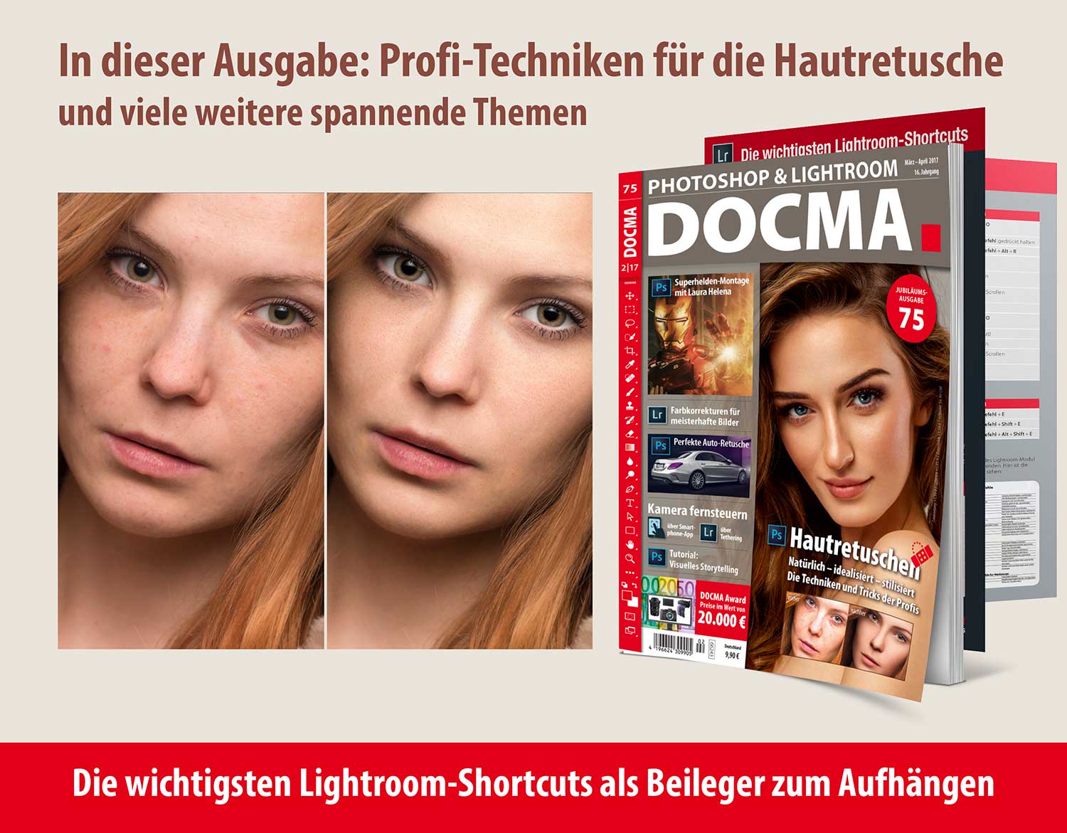Ab sofort können Sie die druckfrische neue DOCMA-Ausgabe, das DOCMA Jubiläumsheft 75, versandkostenfrei bei uns im DOCMAshop vorbestellen. Das „Early-Bird“-Angebot gilt aber nur bis zum Erstverkaufstag des Heftes am nächsten Mittwoch, den 8. Februar 2017. Abonnenten in Deutschland sollten die Ausgabe an diesem Wochenende im Briefkasten finden, DOCMAtiker in Österreich und der Schweiz Anfang der kommenden Woche. Wer ein DOCMA-Kombi-Abo besitzt, findet das ePaper ebenfalls ab dem 8.2.2016 in seiner DOCMA-App.