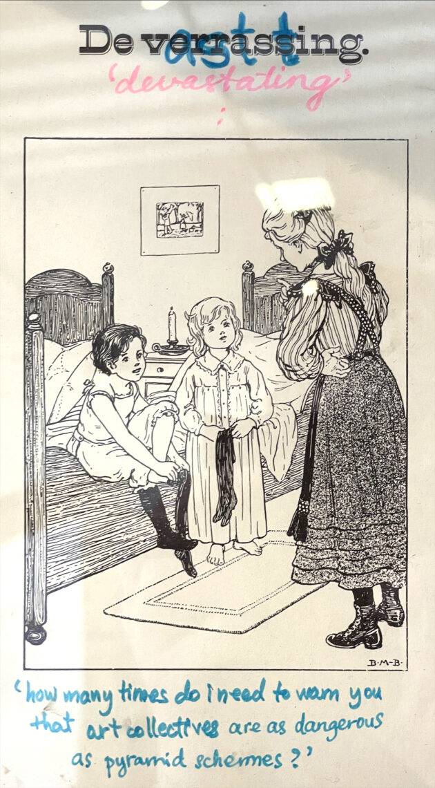 Nicht alles, was auf der documenta fifteen präsentiert wird, ist wirklich gelungen, und bei manchen dezidiert politischen Präsentationen fragte ich mich, worin die künstlerische Auseinandersetzung mit dem Thema bestand. So im Fall der Aboriginal Embassy auf dem Friedrichsplatz, einer bloßen Abspielstation für öde Videos und ihrem Namen zum Trotz keine Repräsentanz australischer Ureinwohner (übrigens just an der Stelle, an der Walter De Maria 1977 seinen Vertikalen Erdkilometer versenkt hatte, insgesamt 1000 Meter lange Messingstäbe, die also nicht ganz bis Australien reichten). Gerade die simpelsten Werke stellten sich manchmal als besonders pfiffig heraus, wie etwa Dan Perjovschis Graffiti auf den Säulen des Friedricianums und dem Platz vor dem Kulturbahnhof, oder auch die Werbeschilder für die fiktive muslimische Fastfood-Kette „Halal Fried Chicken“, die sich im ganzen Stadtgebiet finden.