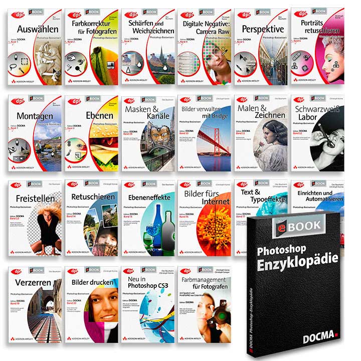 Dazu gibt es interaktive Links zwischen den Bänden und Suchfunktionen, außerdem sind alle Arbeitsmaterialien enthalten. Seit dem Erscheinen der Reihe ist zwar einige Zeit vergangen, aber alle vorgestellten Basistechniken sind nach wie vor gültig und verfügbar, und wurden von neueren Photoshop-Versionen in der Regel nur mehr oder weniger erweitert. Selbst wenn Sie nur einen einzigen Band der Reihe wirklich brauchen würden, weil Sie sonst schon alles wissen, zahlen Sie nicht mehr als damals in Buchform … und kriegen die anderen 21 Bände gratis dazu.