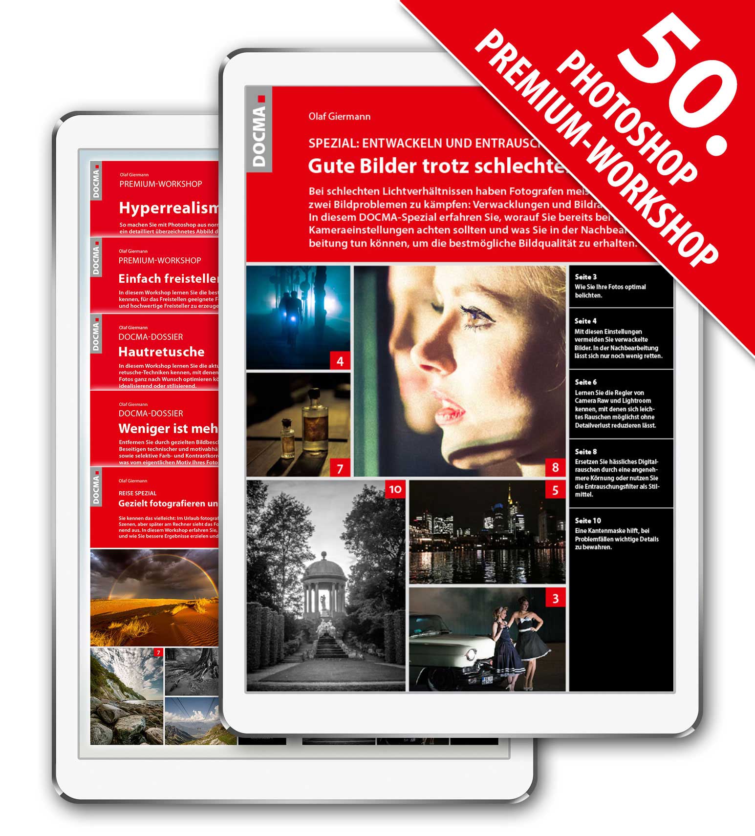 DOCMA feiert das Erscheinen des 50. Photoshop-Premium-Workshops mit 25% Rabatt auf alle Workshops der Reihe.