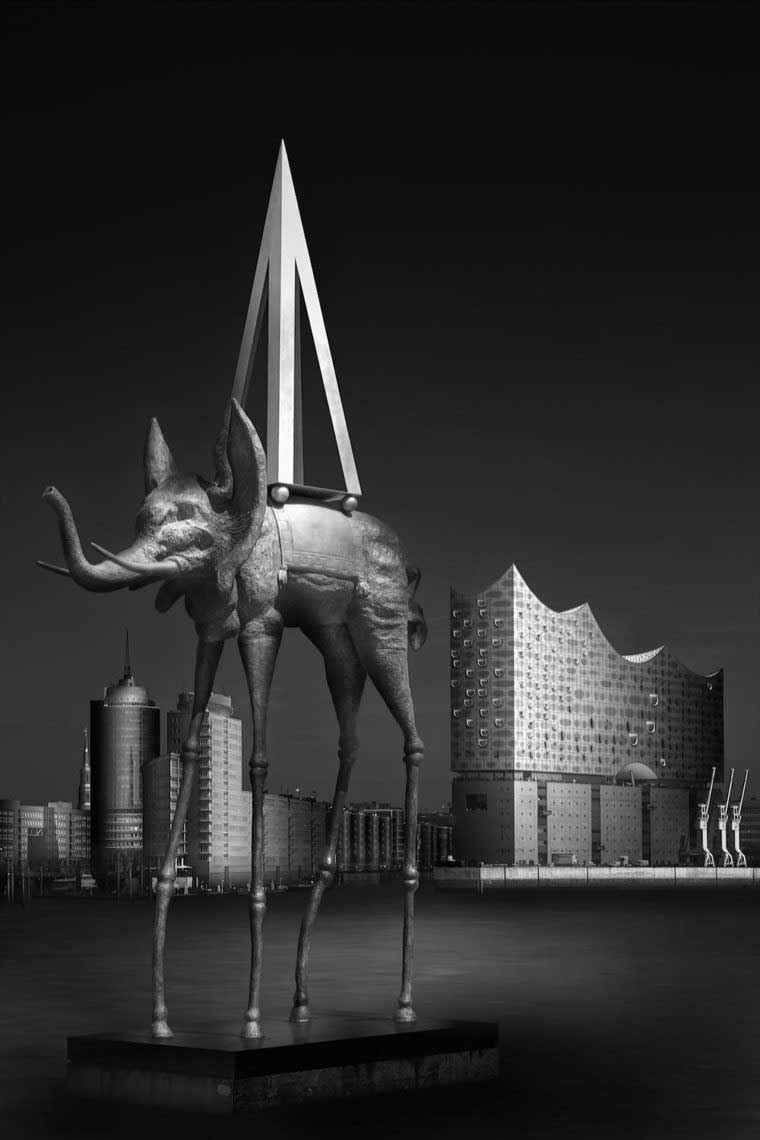 Schwere Dinge auf eine Tragkonstruktion zu setzen, ohne dass das Bauwerk zusammenbricht – dieses Motiv zieht sich von Francesco Colonnas Vision von 1499 über Berninis und Ferratas Skulptur von 1667 und Salvador Dalís diversen Space Elephants aus dem 20. Jahrhundert bis zur Elbphilharmonie, die 2016 eröffnet wurde. Das sind mehr als 500 Jahre Remix der künstlerischen Versinnbildlichung eines statischen Problems, auf die das Bild von Achim Korherr verweist.