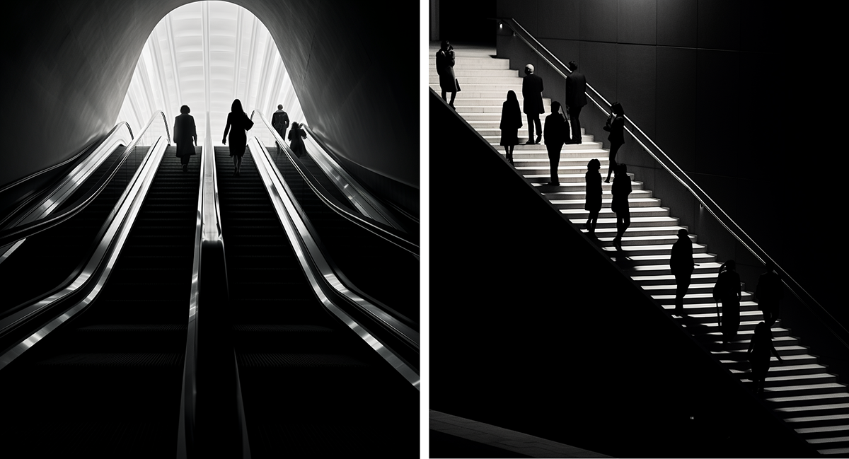 Gerade dieses Verallgemeinerbare, quasi die platonische Idee der zwergenhaften Verlorenheit des Einzelnen zwischen den großflächigen Strukturen moderner Architektur, ist nun etwas, dass sich als grobe Beschreibung ohne allzu genaue Konkretisierung recht gut fassen … und dann als Prompt für eine KI-Generierung verwenden lässt.