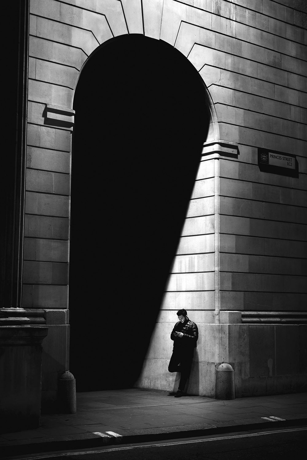 Neben den Gestaltungselementen Licht und Schatten gibt es natürlich auch eine inhaltliche Klammer der vielen Fotos in diesem Band. Entdeckt hat er die zunächst nicht selbst, sondern 2017 ein Freund, dem er seine Bilder zeigte. Er sagte: „Was ich sehe, sind Menschen, die von der modernen Welt um sie herum verkleinert zu sein scheinen.“ Erst da sei ihm klar geworden, was er bisher selbst nicht in Worte gefasst hatte.