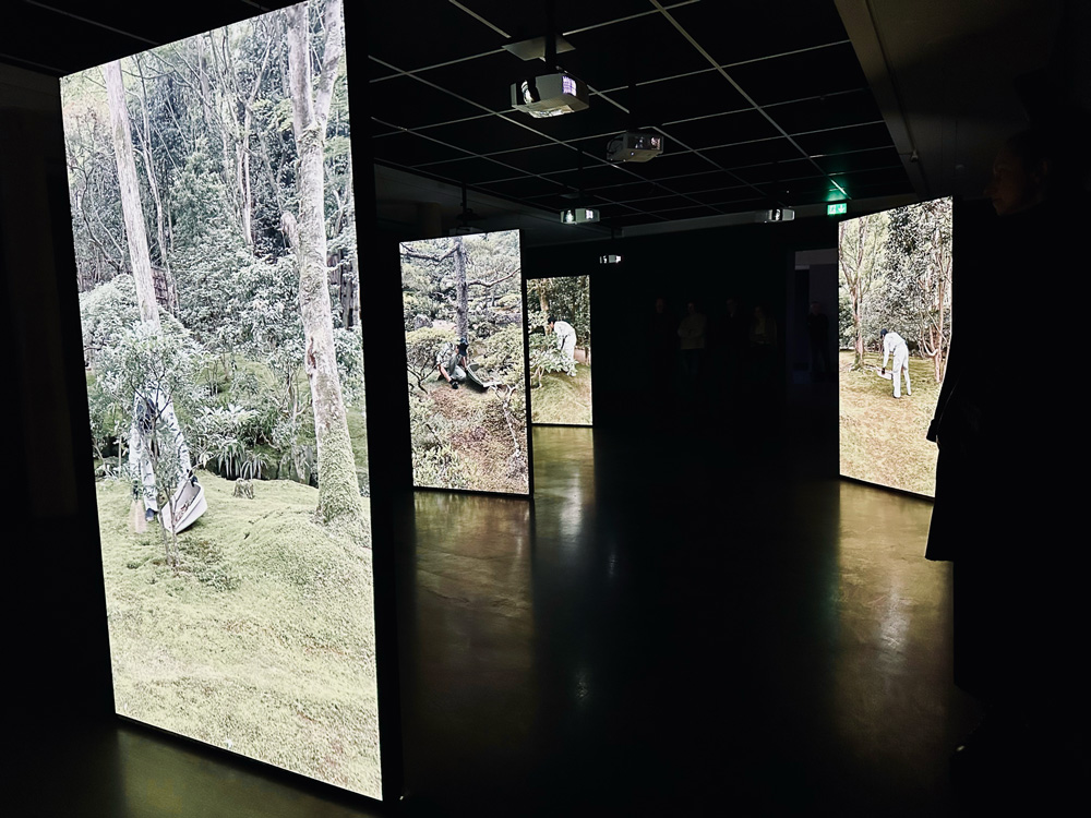 Eine Etage höher im selben Gebäude ist Sam Youkilis Bewegtbildinstallation „Under the Sun“ zu sehen. Er fängt „die Sehnsüchte und Verheißungen des Reisens sowie die Schönheit des Alltäglichen ein“. Interessant ist hier vor allem die Präsentation der kurzen, oft kitschig-bunten Videos. In dunklen Räumen sind auf mannshohen Hochkantmonitoren kurze, parallel ablaufende Videosequenzen zu sehen, die sich immer um ein Thema drehen. Die Stilistik erinnert an Creator Content auf Social-Media-Kanälen, die Monitore an überdimensionale Smartphones und die Parallelität der Darstellungen verweist auf die schnelllebige Bildkultur des Doomscrollings. Diese Präsentationsform wird als ein „immersiver Ausstellungsraum“ bezeichnet, in den das c/o Berlin Sam Youkilis visuelles Archiv aus zehntausenden von Aufnahmen in Form von iPhone-Videosequenzen übertragen hat. Hier liegt die Substanz augenscheinlich auch in der Quantität.