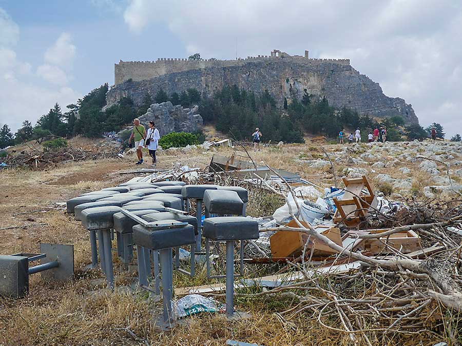Na ja, eben nicht alles. Plastikflaschen und Verpackungen liegen in der ansonsten unberührten Natur herum; auf dem Parkplatz in Lindos (oben auf dem Foto die Akropolis der Stadt, ehemals Athena-Tempel, dann mittelalterliche Festungsanlage der Johanniter-Ritter) rosten etliche Schrottautos vor sich hin, die dort jemand entsorgt hat, und auf dem Weg von einem anderen Parkplatz in die Stadt bietet sich die oben dokumentierte Szene.