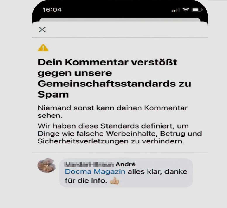 „Dein Kommentar verstößt gegen unsere Gemeinschaftsstandards zu Spam. Sonst niemand kann deinen Kommentar lesen. Wir haben diese Standards definiert, um Dinge wie falsche Werbeinhalte, Betrug und Sicherheitsverletzungen zu verhindern.“