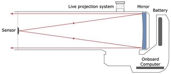Das eVscope ist sehr einfach aufgebaut: Der Hauptspiegel projiziert ein Bild auf einen CMOS-Sensor. Die daraus ausgelesenen Daten werden vom Prozessor verarbeitet und auf einem elektronischen Sucher mit OLED-Display angezeigt. (Quelle: Unistellar)
