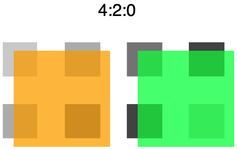 Die Farbunterabtastung 4:2:0 geht noch einen Schritt weiter: Für die zweite Pixelzeile werden gar keine Farbwerte gespeichert, so dass diese Pixel mit den Farbwerten der ersten Zeile versorgt werden müssen. Dazu werden die Farben von jeweils vier Pixeln gemittelt und dieser Mittelwert gespeichert. Neben den 8 Helligkeitswerten sind nur noch 4 (2 × 2) Farbwerte nötig, also insgesamt 12 Werte. Gegenüber den 24 Werten ohne Farbunterabtastung ist das eine Reduktion auf die Hälfte.