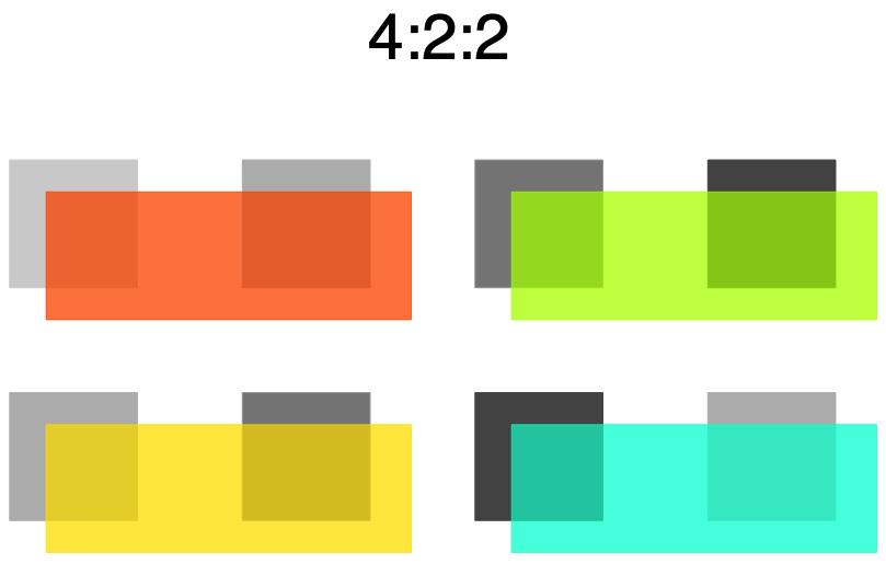 Bei einer Farbunterabtastung von 4:2:2 werden für je vier Pixel einer Zeile nur zwei Farbwerte gespeichert. Die Farbwerte zweier nebeneinander liegender Pixel müssen dazu gemittelt werden. Zu den 8 Helligkeitswerten kommen noch 8 (2 × 4) Farbwerte, insgesamt folglich 16. Gegenüber den 24 Werten ohne Farbunterabtastung haben wir ein Drittel eingespart.