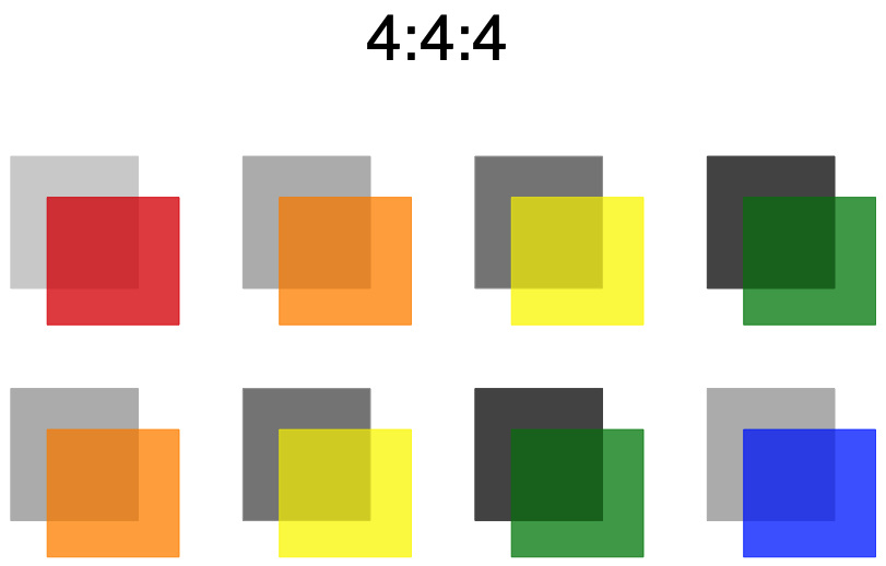 4:4:4 ist tatsächlich gar keine Farbunterabstastung, denn es werden alle Farbinformationen gespeichert. Zu den je vier Helligkeitsinformationen pro Zeile kommen ebenfalls je vier Farbinformationen. Das sind 8 Helligkeitswerte (Y) und 16 Farbwerte, denn für die Farbinformation müssen ja jeweils zwei Werte, Cr und Cb, gespeichert werden, insgesamt also 24 Werte.