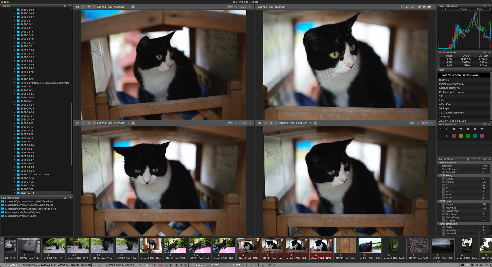 Der Mehrfenster-Modus ist hilfreich bei der Entscheidung, welches von zwei oder mehr Fotos das bessere ist. Wie beim Selektieren von Dateien geht der FastRawViewer auch beim Mehrfenster-Modus einen anderen Weg als zum Beispiel Lightroom Classic oder Capture One. Neben der Einzelbildvorschau gibt es nun auch einen Zwei- und einen Vier-Fenster-Modus. Eins dieser Fenster ist das Hauptfenster, bei dem die Darstellungseigenschaften verändert werden können. Die anderen sind die Vergleichsfenster, in die man Vergleichskandidaten zum Beispiel per Drag-and-drop ziehen kann. Beim Zoomen und Verschieben sind alle Fenster synchronisiert. Leider habe ich noch nicht herausgefunden, ob und wie man den Versatz einzelner Fenster vorübergehend wie in Lightroom Classic (dort: mit Shift) verändern kann, ohne das Synchronisieren gleich ganz auszuschalten.