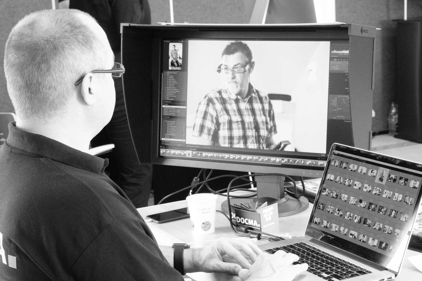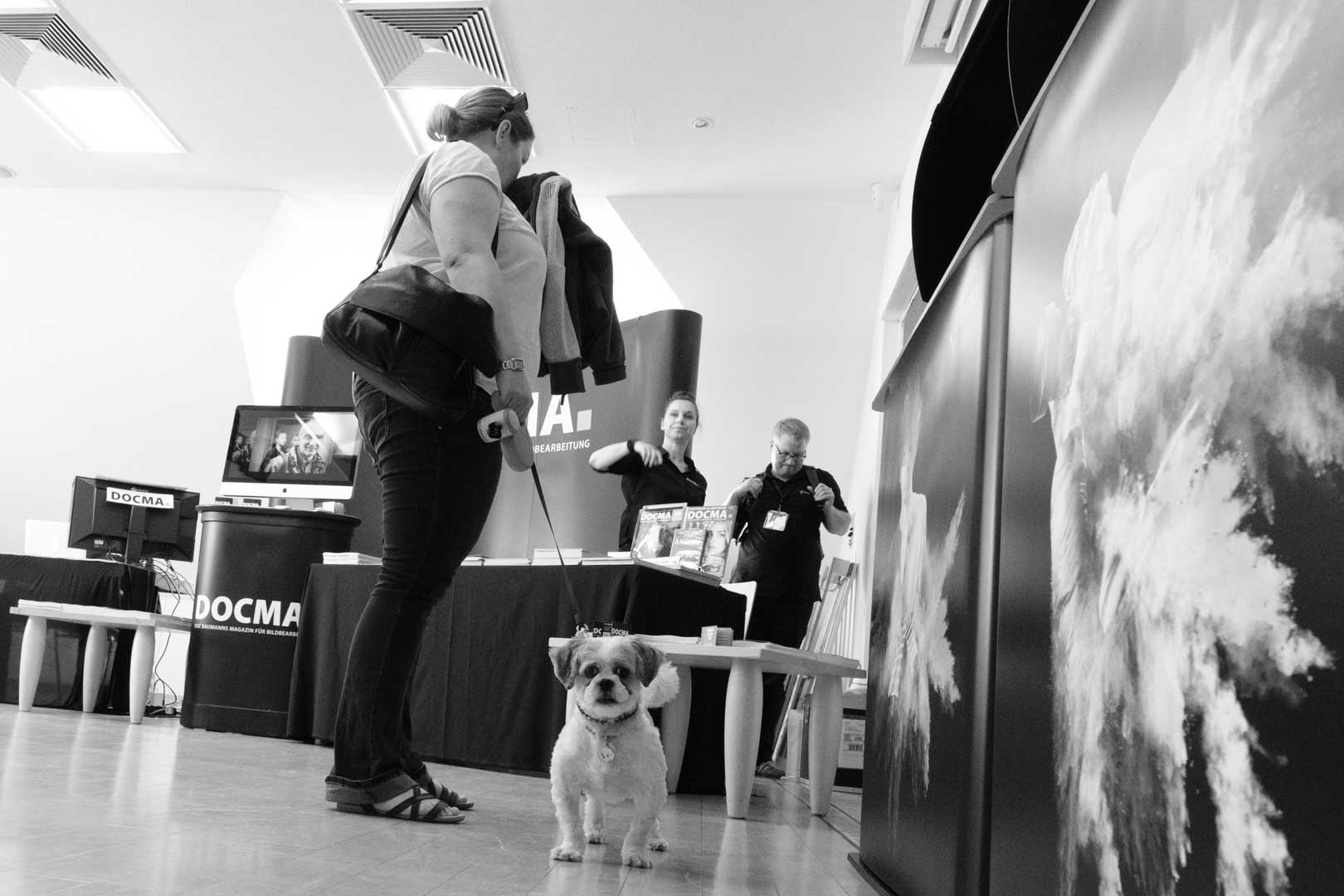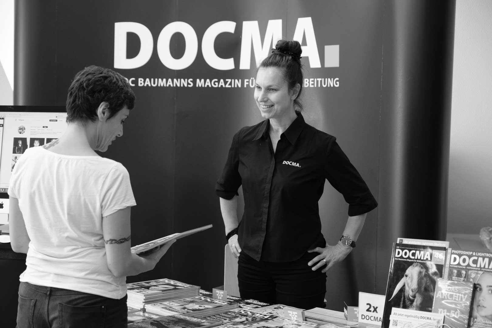 Viele Menschen wurden portraitiert, teils mit Aufwand, teils spontan aus dem Stand. Hier ist Karsten Bruno Rose, Fotograf und Buchauthor als Model im Einsatz.DOCMA pflegt eine enge Zusammenarbeit mit Leuten wie Karsten Rose, die auch Dozenten für Bildbearbeitung sind. Im kleinen Raum des Festivals wird hauptsächlich mit Laptops gearbeitet.Am angeschlossenen Bildschirm wird kritisch jede Anpassung überprüft, hier scheint allerdings der kritische Blick dem Bildbearbeiter zu gelten.Neugierig schauen Festivalbesucher dem DOCMA Spezialisten über die Schulter. Alle wurden herzlich empfangen und Fragen wurden gerne und ausführlich beantwortet.DOCMA pflegt auch eine enge Zusammenarbeit mit anderen Ausstellern, wie zum Beispiel mit Epson, sodass Bilder sofort hochwertig ausgedruckt werden. Viele der fotografierten Besucher des Festivals konnten daher sofort ihr Porträt als Print mitnehmen.DOCMA arbeitet mit „Spydercube“ und „ColorCheckr“ um von der Aufnahme bis zum Druck absolute Farbtreue und tonwertkorrekte Bildergebnisse zu erhalten.Viele Prominente stellten sich gerne für DOCMA vor die Kamera. Hier zu sehen ist Steve Thornten; aber auch Greg Gorman, Walter Schels, Heinz Teufel und viele mehr sind vertreten. Kult ist auch das DOCMA-Mobil im Hintergrund.Offen, präsent, freundlich und stellvertretend für das ganze Team, präsentiert Ina hier Exemplare der Zeitschrift. Das DOCMA Magazin enthält nicht nur wertvolle Tipps und Tricks für eingeschworene „Photoshop“-Enthusiasten, sondern auch besondere Hinweise für Anhänger von „Lightroom“ und allgemeiner digitaler Bildbearbeitung. Somit ist im Grunde für jeden etwas dabei.Bei aller Ernsthaftigkeit, Seriosität und tiefschürfendem Fachwissen – tierischer Ernst ist dem DOCMA Team fremd und es war toll einen Blick hinter die Kulissen werfen zu dürfen.Wie auch hier sichtbar wird: Die Freude, an dem was sie tun, war jeden Moment spürbar.Der Aufwand ist groß, die Konkurrenz hart, aber ich bin überzeugt, mit der positiven Einstellung wird es auch in ferner Zukunft DOCMA geben. Die Technik und somit auch die digitale Bildbearbeitung ist in ständiger Entwicklung – Stichwort Lichtfeldfotografie. Das DOCMA uns dabei auf dem Laufenden hält, versteht sich doch von selbst, nicht wahr?