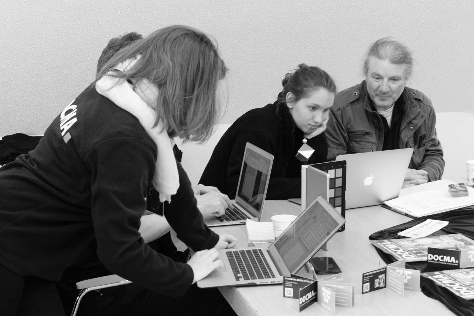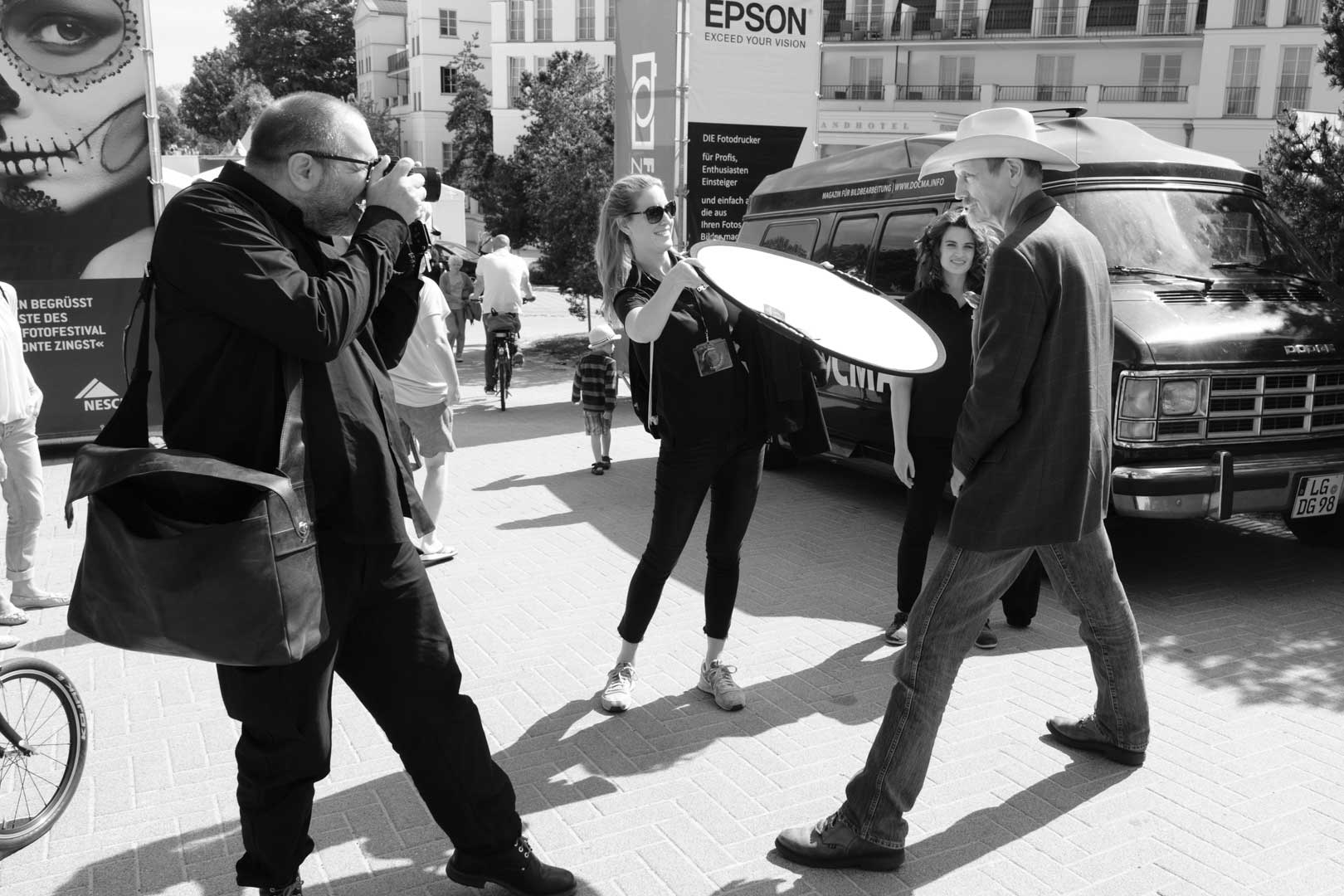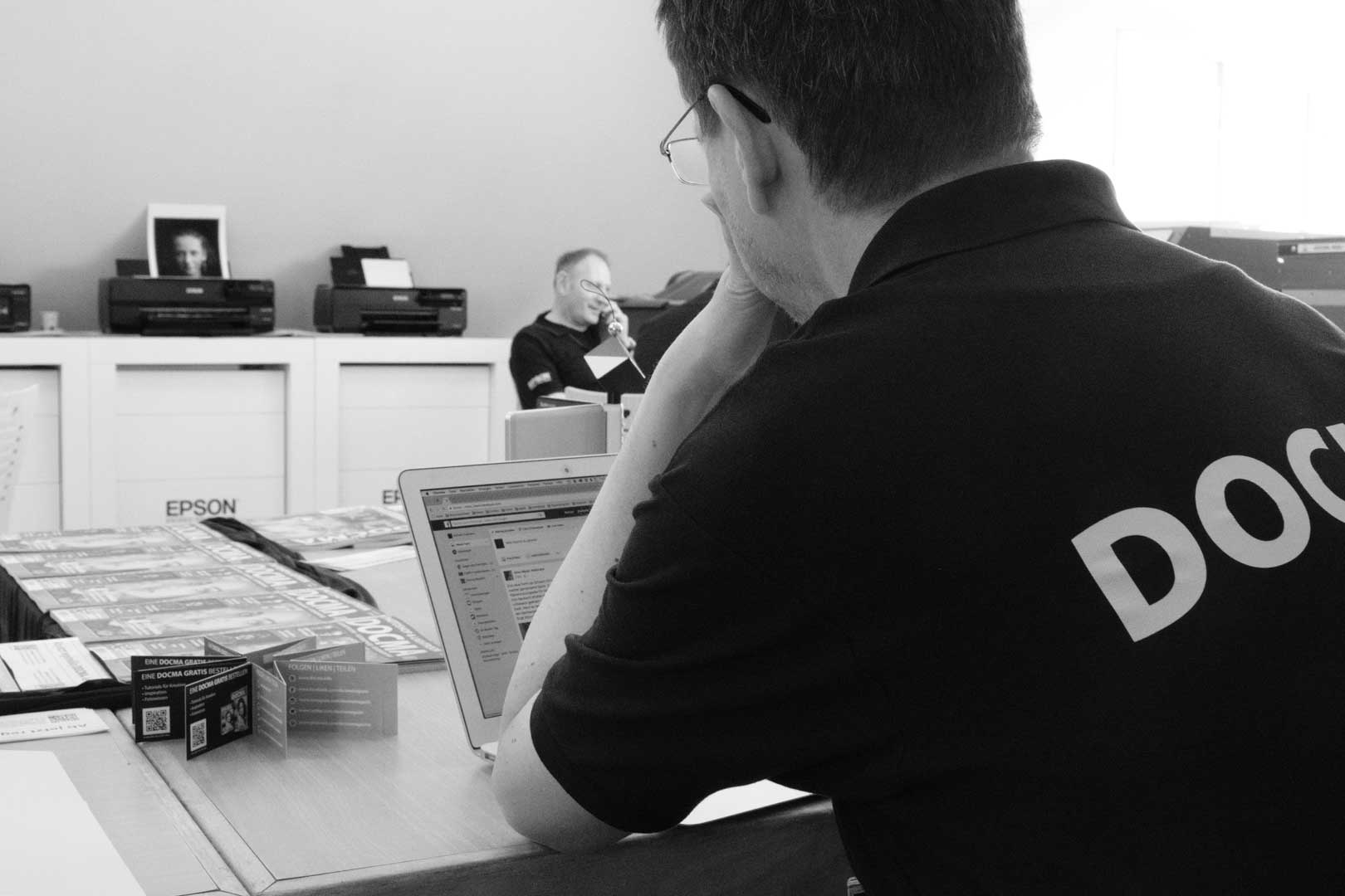 Viele Menschen wurden portraitiert, teils mit Aufwand, teils spontan aus dem Stand. Hier ist Karsten Bruno Rose, Fotograf und Buchauthor als Model im Einsatz.DOCMA pflegt eine enge Zusammenarbeit mit Leuten wie Karsten Rose, die auch Dozenten für Bildbearbeitung sind. Im kleinen Raum des Festivals wird hauptsächlich mit Laptops gearbeitet.Am angeschlossenen Bildschirm wird kritisch jede Anpassung überprüft, hier scheint allerdings der kritische Blick dem Bildbearbeiter zu gelten.Neugierig schauen Festivalbesucher dem DOCMA Spezialisten über die Schulter. Alle wurden herzlich empfangen und Fragen wurden gerne und ausführlich beantwortet.DOCMA pflegt auch eine enge Zusammenarbeit mit anderen Ausstellern, wie zum Beispiel mit Epson, sodass Bilder sofort hochwertig ausgedruckt werden. Viele der fotografierten Besucher des Festivals konnten daher sofort ihr Porträt als Print mitnehmen.DOCMA arbeitet mit „Spydercube“ und „ColorCheckr“ um von der Aufnahme bis zum Druck absolute Farbtreue und tonwertkorrekte Bildergebnisse zu erhalten.Viele Prominente stellten sich gerne für DOCMA vor die Kamera. Hier zu sehen ist Steve Thornten; aber auch Greg Gorman, Walter Schels, Heinz Teufel und viele mehr sind vertreten. Kult ist auch das DOCMA-Mobil im Hintergrund.Offen, präsent, freundlich und stellvertretend für das ganze Team, präsentiert Ina hier Exemplare der Zeitschrift. Das DOCMA Magazin enthält nicht nur wertvolle Tipps und Tricks für eingeschworene „Photoshop“-Enthusiasten, sondern auch besondere Hinweise für Anhänger von „Lightroom“ und allgemeiner digitaler Bildbearbeitung. Somit ist im Grunde für jeden etwas dabei.Bei aller Ernsthaftigkeit, Seriosität und tiefschürfendem Fachwissen – tierischer Ernst ist dem DOCMA Team fremd und es war toll einen Blick hinter die Kulissen werfen zu dürfen.Wie auch hier sichtbar wird: Die Freude, an dem was sie tun, war jeden Moment spürbar.Der Aufwand ist groß, die Konkurrenz hart, aber ich bin überzeugt, mit der positiven Einstellung wird es auch in ferner Zukunft DOCMA geben. Die Technik und somit auch die digitale Bildbearbeitung ist in ständiger Entwicklung – Stichwort Lichtfeldfotografie. Das DOCMA uns dabei auf dem Laufenden hält, versteht sich doch von selbst, nicht wahr?