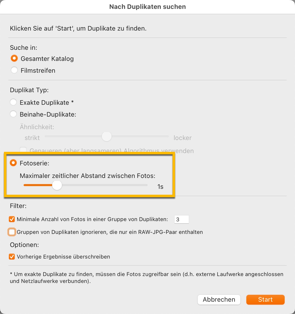 Dann sprang mich aber der Gedanke plötzlich förmlich an: Eine Fotoserie ist ja im Prinzip nichts anderes als ein Duplikat – wenn auch nicht exakt identisch. Also dachte ich mir, probieren wir doch einmal den Duplikate-Finder von Excire Search aus. Und lustigerweise sprang mich im Such-Dialog auch gleich das an, was ich gesucht hatte. Die Suche nach Fotoserien!