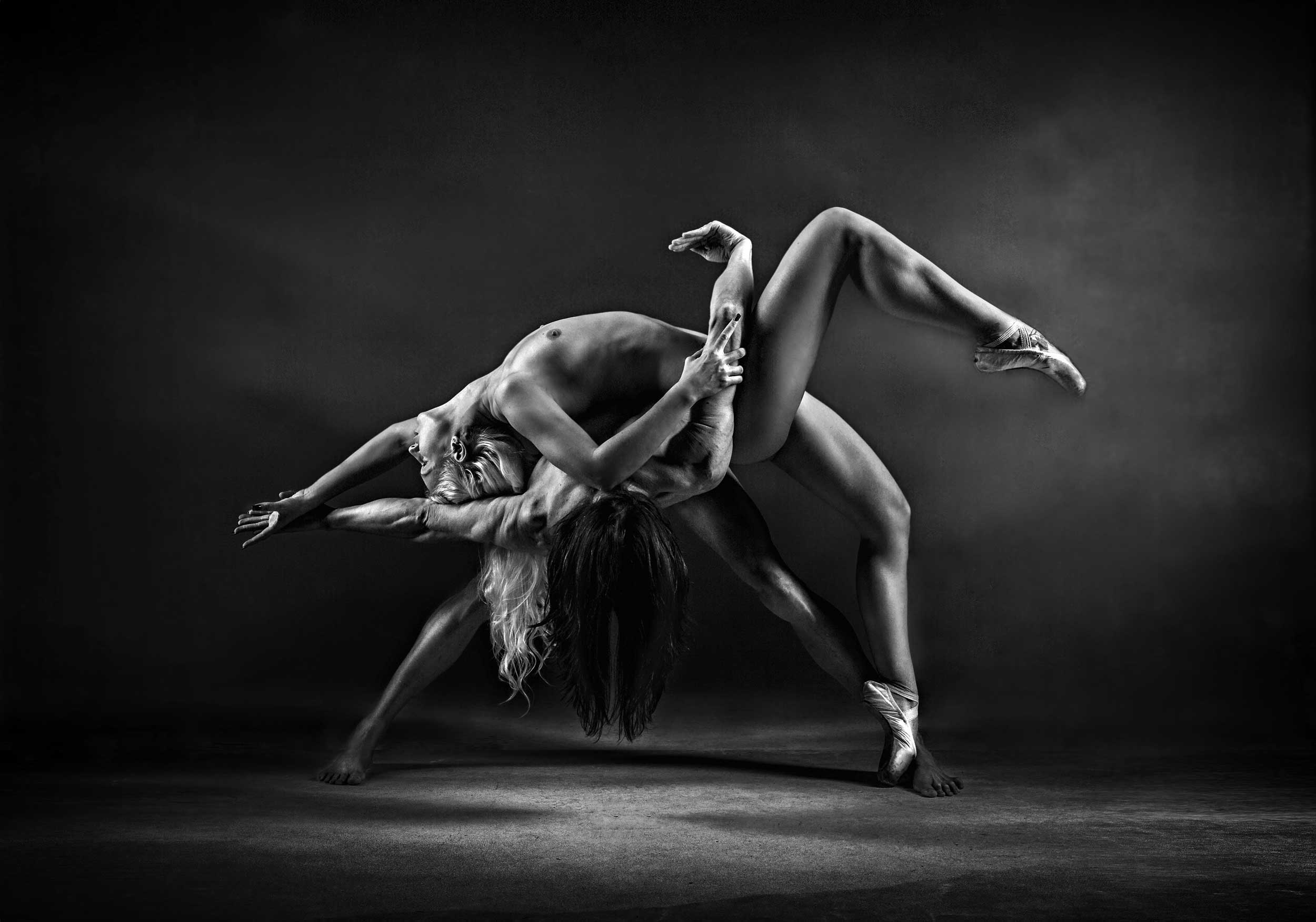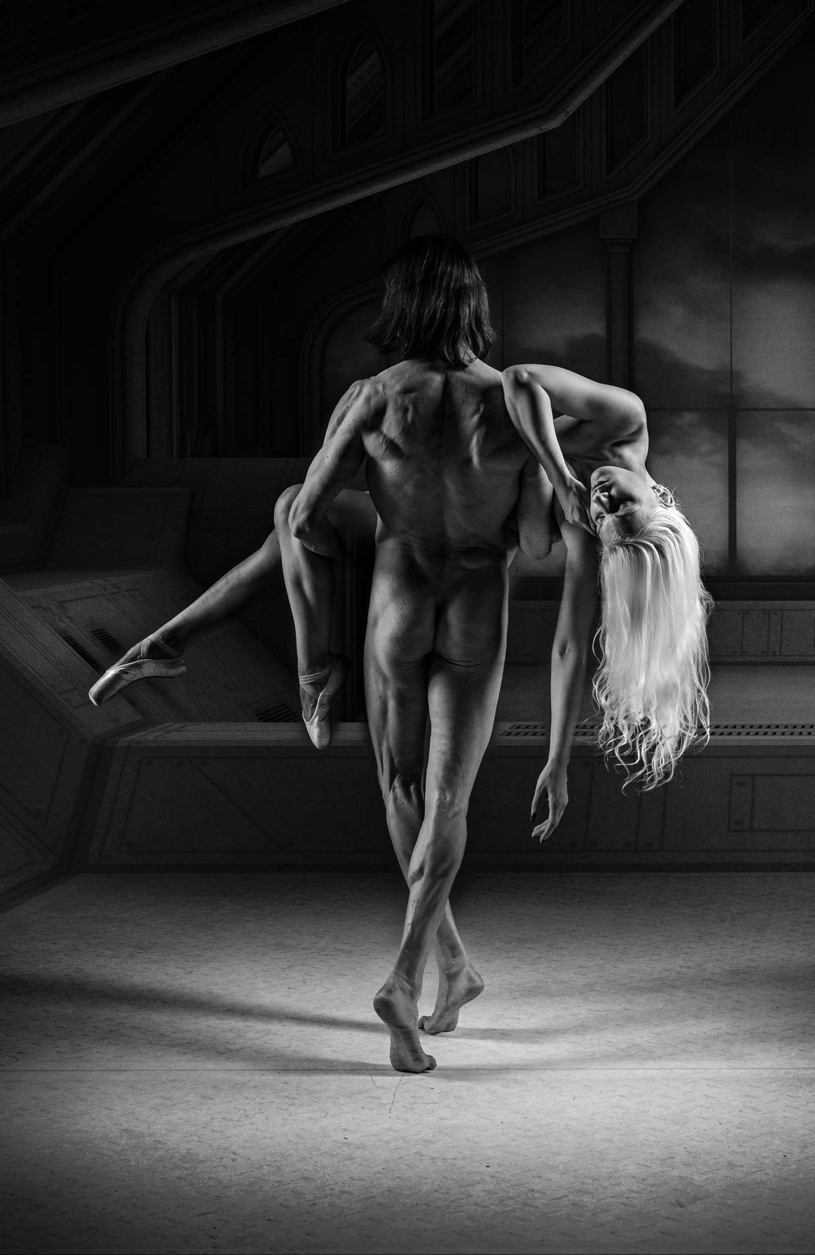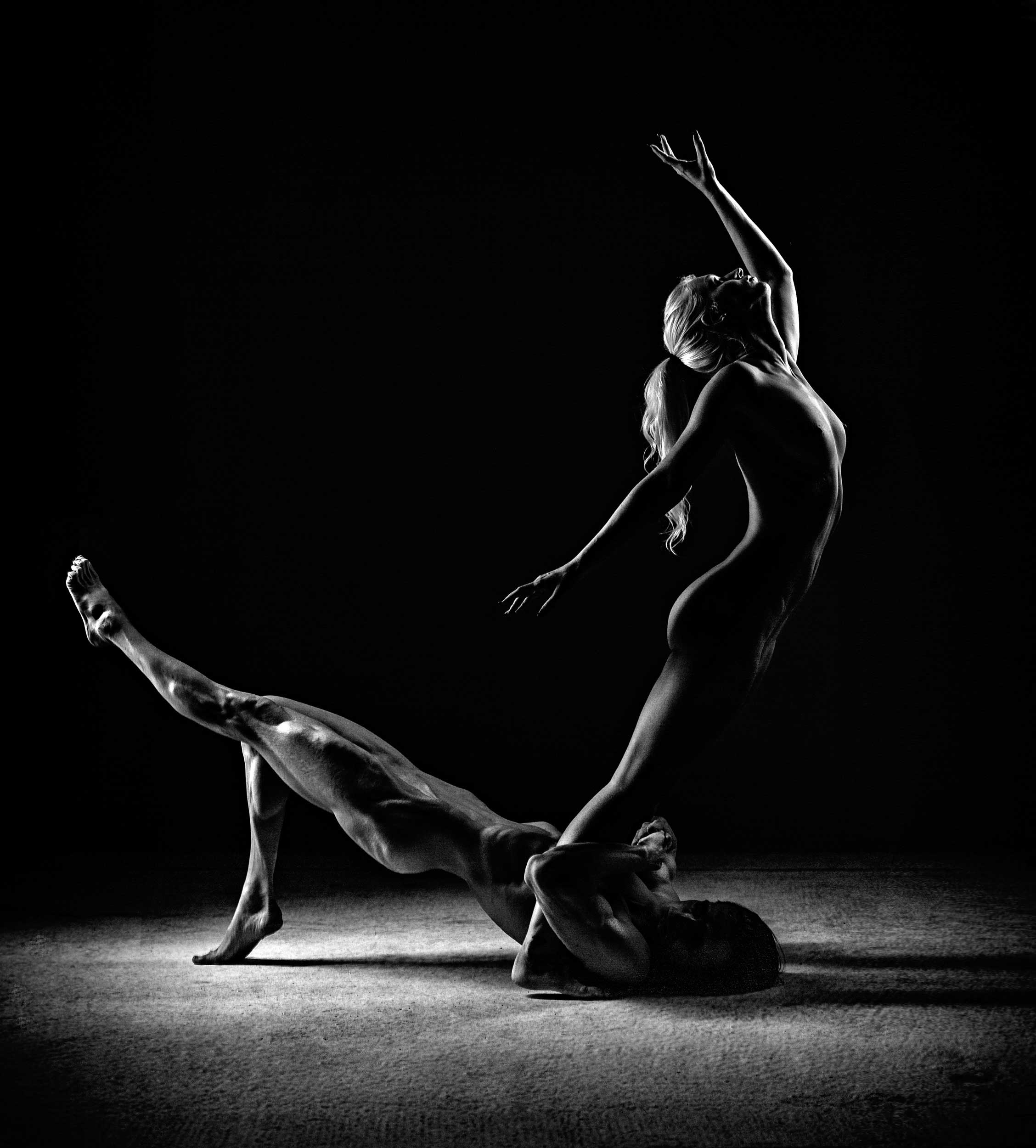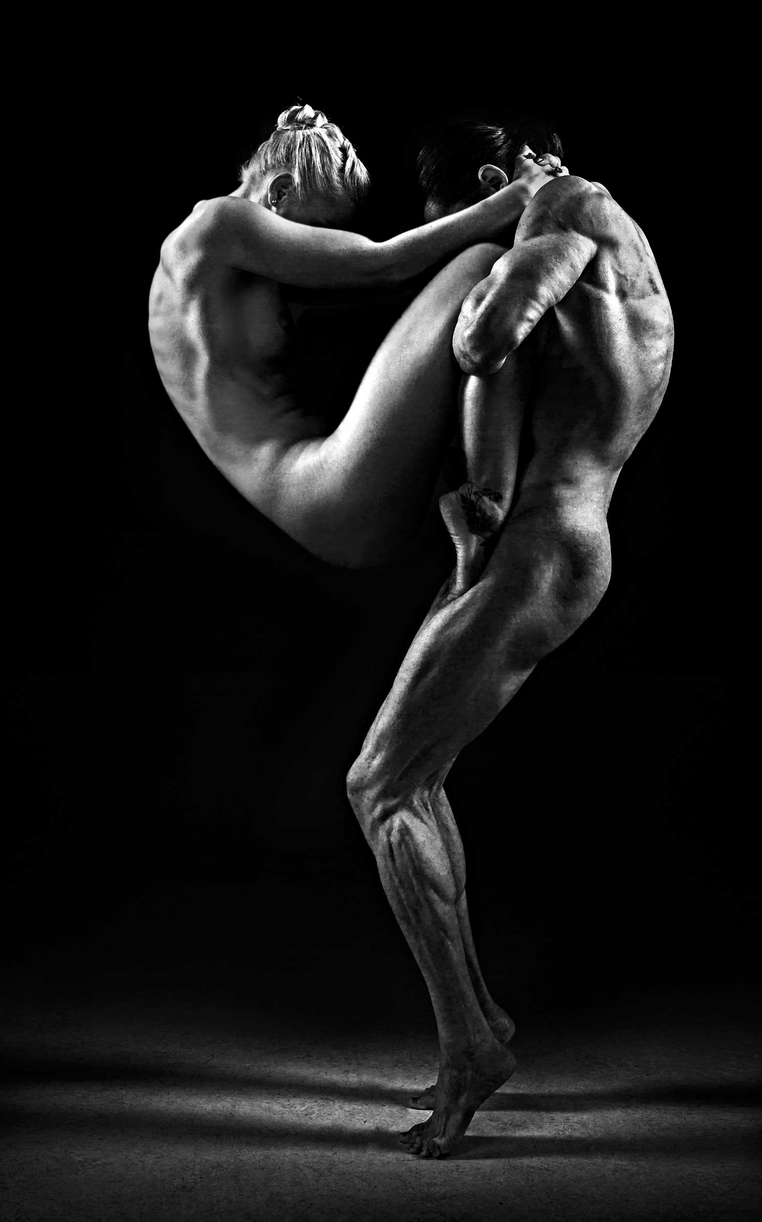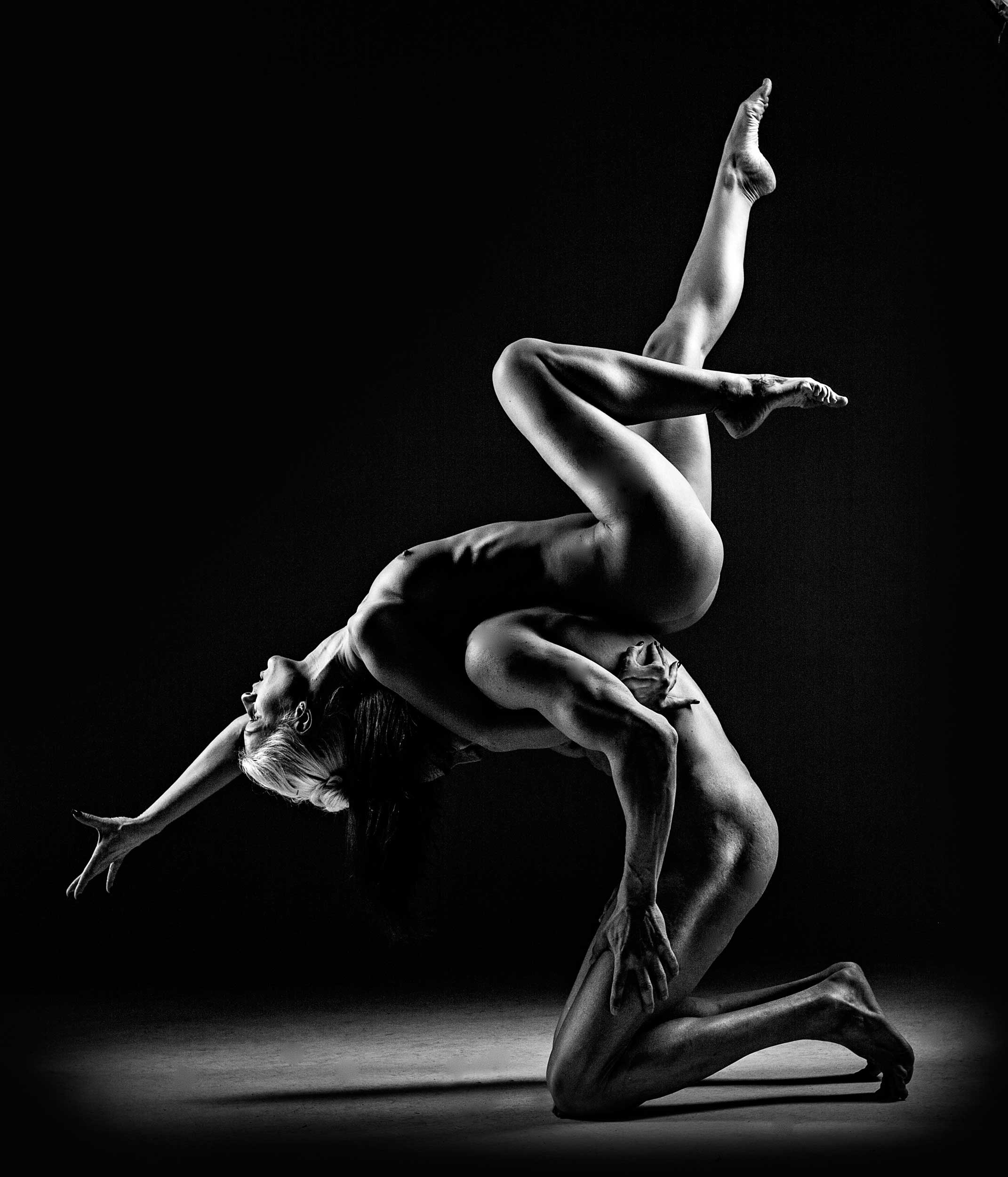 Als besonders schwierig, nicht nur vom Licht her, sondern auch vom Timing stellt sich die Pose heraus, bei der Aza sich im Wegkippen befindet. Hartes Konturlicht auf dem Model Aza gemischt mit hartem Licht auf dem Köper des Fitness-Champions Patrick Heisel. Hier kommt es darauf an, dass der Halter Patrick nur teilweise in Szene gesetzt und Aza genau im richtigen Zeitpunkt anfokusiert und mit Licht aus der Tiefe freigestellt wird. Es war zeitaufwendig und für die beiden sehr schweißtreibend.