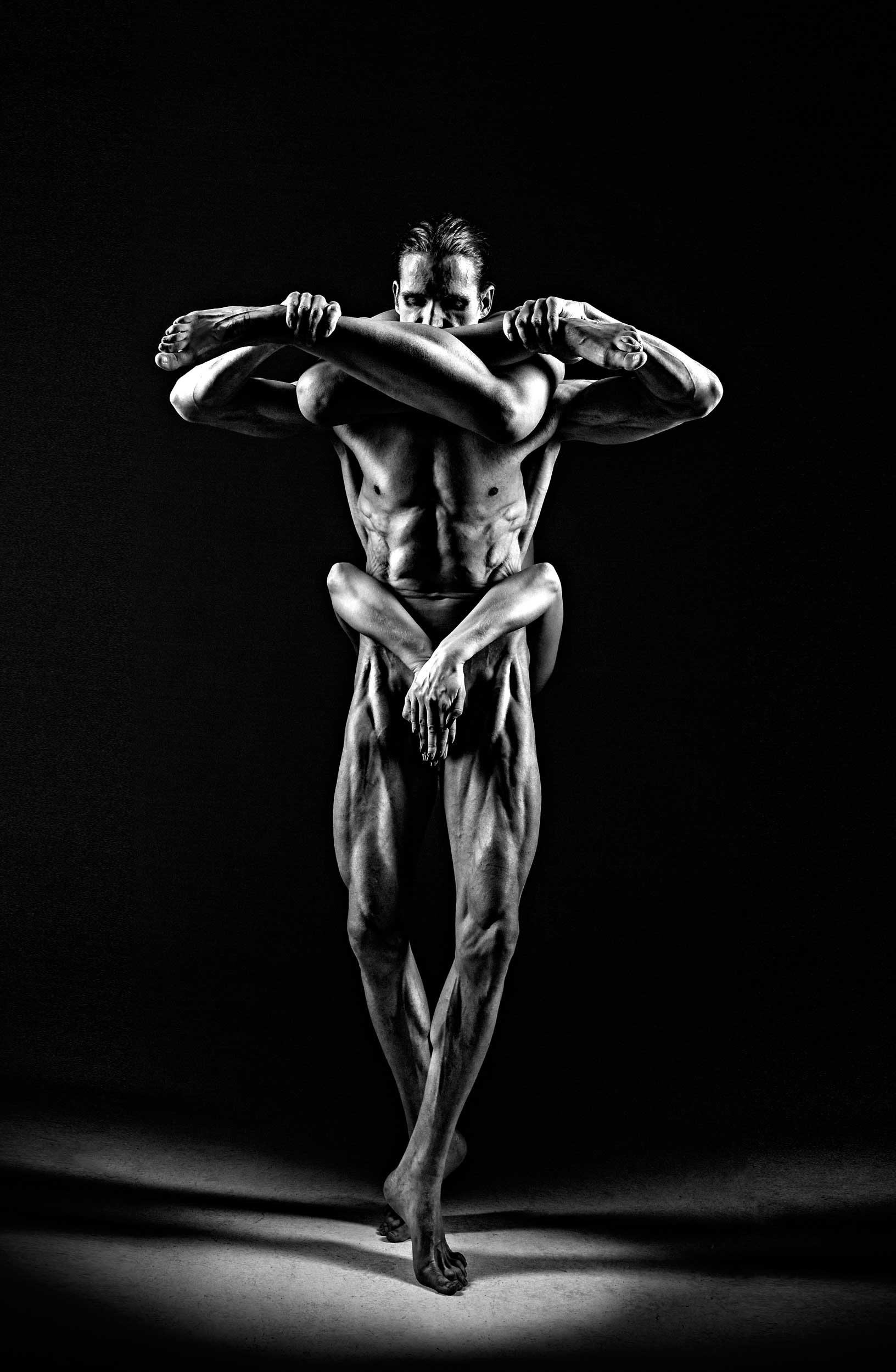Schon beim ersten Posing, bei dem Aza bei Patrick die Beine um seinen Hals verschränkte und nach hinten über seinen Rücken überkippte, gleichzeitig dessen Geschlecht mit beiden Händen abdeckte, stellt es sich heraus, wie genial dieses Objektiv arbeitet. Extreme Schärfe, Lichtverläufe optimal ausgenutzt und der Autofukus schneller als die beiden agierenden Körper. Wir übertragen die Bilder über den Laptop zum Bildschirm und können so direkt gemeinsam diskutieren. Jedes Posing wird oft fünf- bis achtmal wiederholt. Solange halt, bis jeder zufrieden ist. Es ist eine kreative Teamarbeit zwischen dem Fotografen und den Körperakrobaten. Vor jedem Set wird das Posing exakt besprochen. Vor Ort, in der Hohlkehle im Einstelllicht, demonstrieren die Akrobaten die Ausdehnungen der Pose, denn nur dann klappt das Licht, das sich ja, wie aus den Bildern ersichtlich, oft in einem sehr schmalen Kanal auf die Pose auswirkt,. Ein Verdrehen oder ein zu weites Wegklappen endet dann in völliger Dunkelheit der Körperteile.