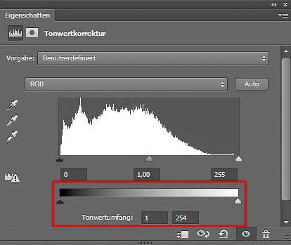 Es hat sich bewährt, die Selektive Farbkorrektur mit einer Tonwert- und Schwellenwert-Ebene in einer Gruppe zusammen zu fassen. Ist die gewünschte Bildwirkung erreicht, sollte über den Schwellenwert der Tonwertumfang auf zugelaufene Schwarz- und ausgefressene Weißwerte kontrolliert werden. Falls solche Stellen im Bild auftauchen wird über die Tonwertebene der Tonwertumfang reduziert. Oft reicht ein Beschnitt um je einen Tonwert am oberen und unteren Ende.
