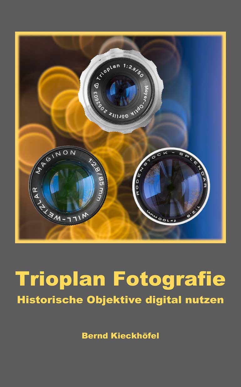 Mehr über Auswahl und Kauf günstiger Trioplan-Objektive mit Brennweiten zwischen 50 und 135 mm finden sich im E-Book „Trioplan Fotografie – Historische Objektive digital nutzen“. Trioplan-Aufnahmen und Colorkey-Bearbeitungen mit Photoshop: Neben anschaulichen Erklärungen zu Aufnahmebedingungen, Motivauswahl und Handhabung wird auch gezeigt, welche Triplet-Optiken aus Projektoren sich mit wenigen Handgriffen in feinfühlig fokussierbare Adapter einsetzen lassen.