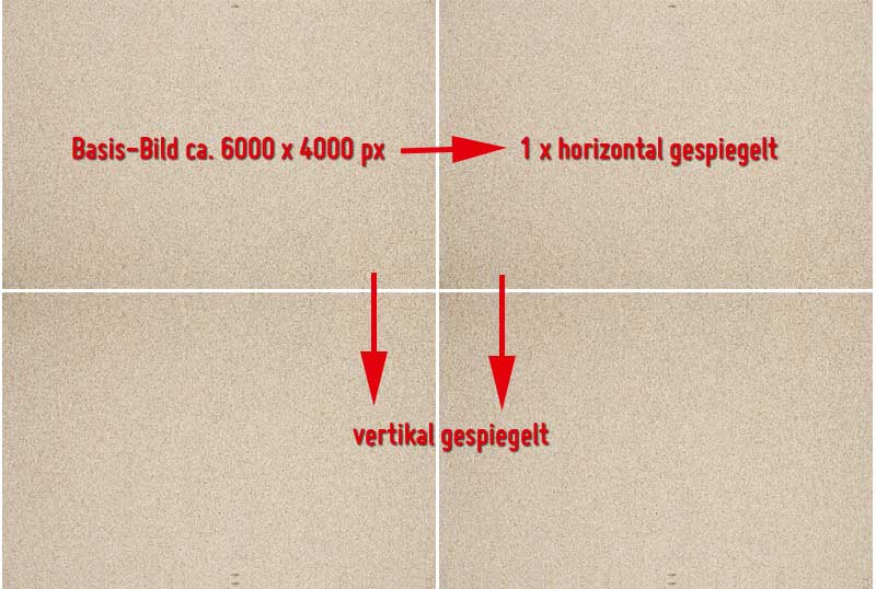 Am Strand von St. Peter-Ording habe ich als Stock-Material eine Sandfläche mit einer Sony alpha 99 fotografiert, das Basis-Foto hat also erstmal ca. 6000 × 4000 Pixel (Vollformat-Sensor). Um eine feinere Struktur zu erhalten, habe ich das Foto einmal horizontal und diese Dopplung dann wiederum vertikal gespiegelt. Hier muss man dann schon etwas eingreifen und unregelmäßig überlappen und etwas retuschieren/nachbelichten/abwedeln weil das Auge die mehrfache Spiegelung ohne Retusche sofort erkennen würde. Die so resultierende Textur-Ebene hat dann also ca. 12000 × 8000 Pixel, was fein genug ist, um auch für hoch aufgelöste Fotos als glaubhaftes Fotokorn einsetzbar zu sein.