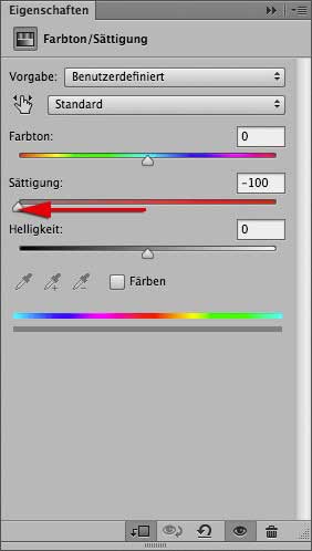 Ich weise der Sand-Ebene eine Farbton/Sättigung-Einstellungsebene mit Schnittmaske zu, die den Sand erst einmal komplett entsättigt.