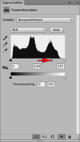 Um das Korn in seiner Intensität regeln zu können, lege ich eine weitere Einstellungsebene vom Typ Tonwertkorrektur mit Schnittmaske an, mit der ich den Kontrast der Texturebene beeinflussen kann. Um den eigentlichen Effekt deutlich zu machen, zeige ich hier eine etwas übertreibene Anwendung.