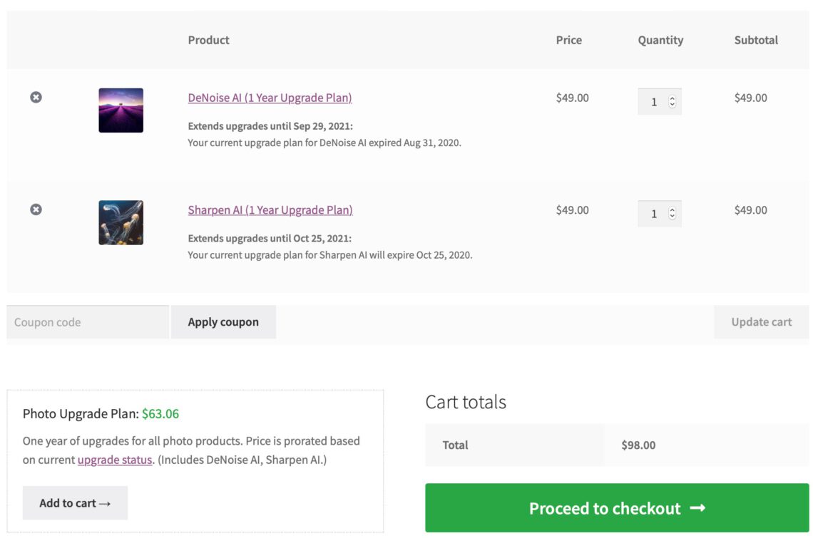 Mit dem ebenfalls im Screenshot gezeigten Photo Upgrade Plan erhältst Du für alle gekauften Plugins zeitgleich die „Upgrade-Verlängerung“ für ein Jahr zu einem deutlich reduzierten Preis. In Deinem Fall 63$.