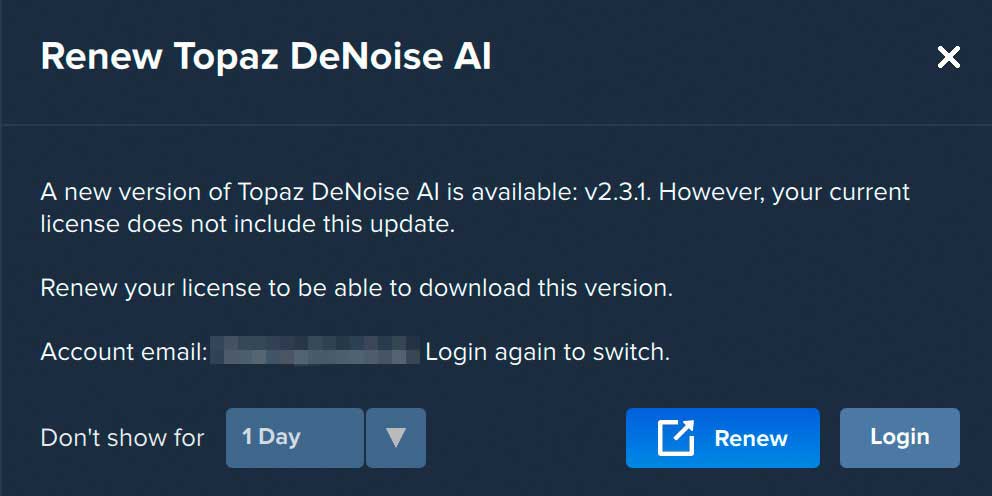 Vor kurzem nun „ploppte“ in Topaz DeNoise AI wieder so eine „Upgrade/Update verfügbar“-Meldung auf – nur mit dem Hinweis, dass meine Update-Lizenz abgelaufen wäre.