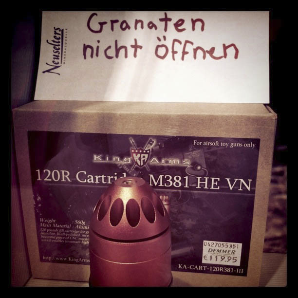 Die eindringliche Warnung vor der Gefahr, dass Kinder Revolver verschlucken könnten, ist dagegen mein eigener böser Beitrag zum Thema, ebenso wie Olaf Giermann eine Montage zu Nuss-Inhaltsstoffen vorbereitet hat. Wenn Sie selbst eine gute Idee haben und ein Bild – das dann allerdings nicht mehr am Wettbewerb teilnehmen könnte – vorstellen möchten: Immer her damit. Wir freuen uns auf viele tolle Ideen.
