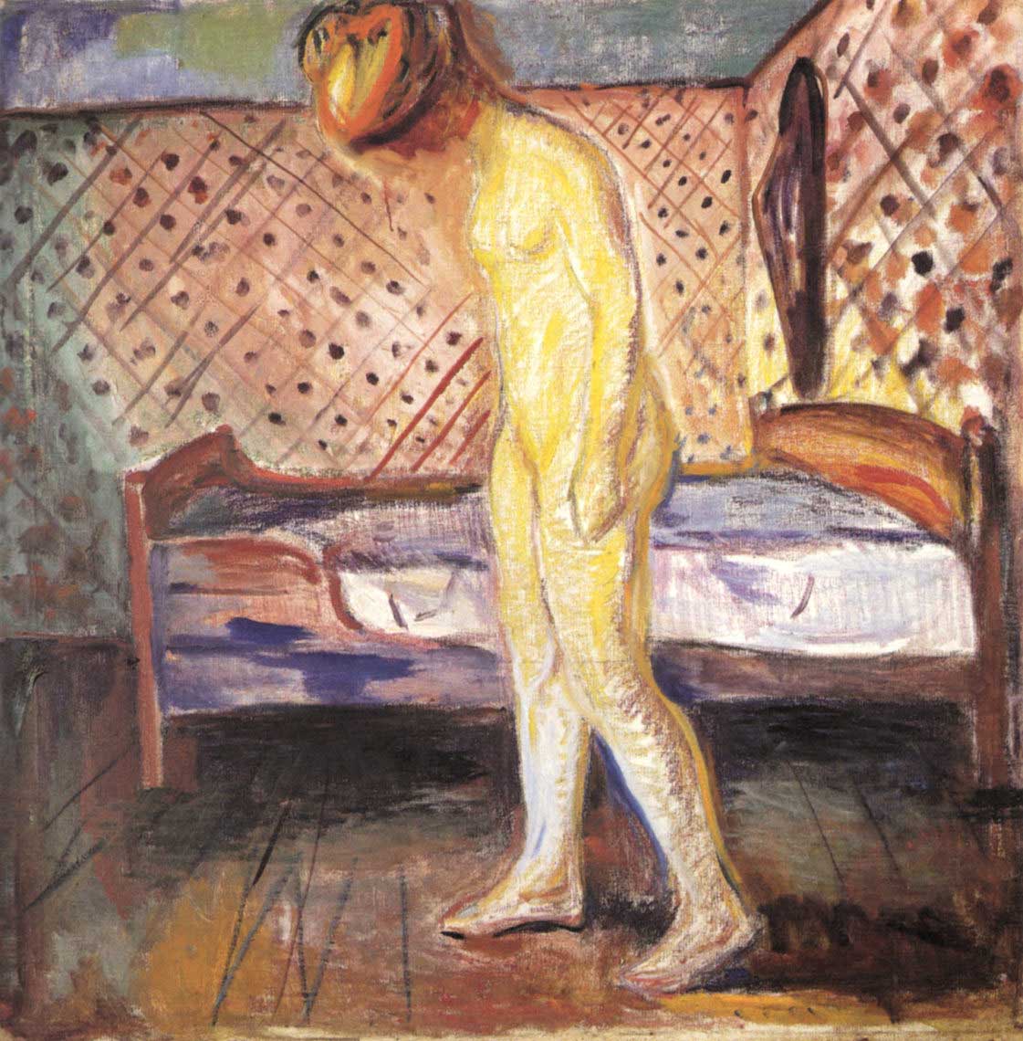 In dem nach dieser Vorlage entstandenen Ölbild nimmt die Frau eine ähnliche Pose ein, und auch der gesamte Bildaufbau entspricht dem Foto, aber Munch hat kein Detail eins zu eins übertragen, sondern frei interpretiert. Dem Ergebnis ist in keiner Weise anzusehen, dass hier ein Foto als Hilfsmittel herangezogen wurde.