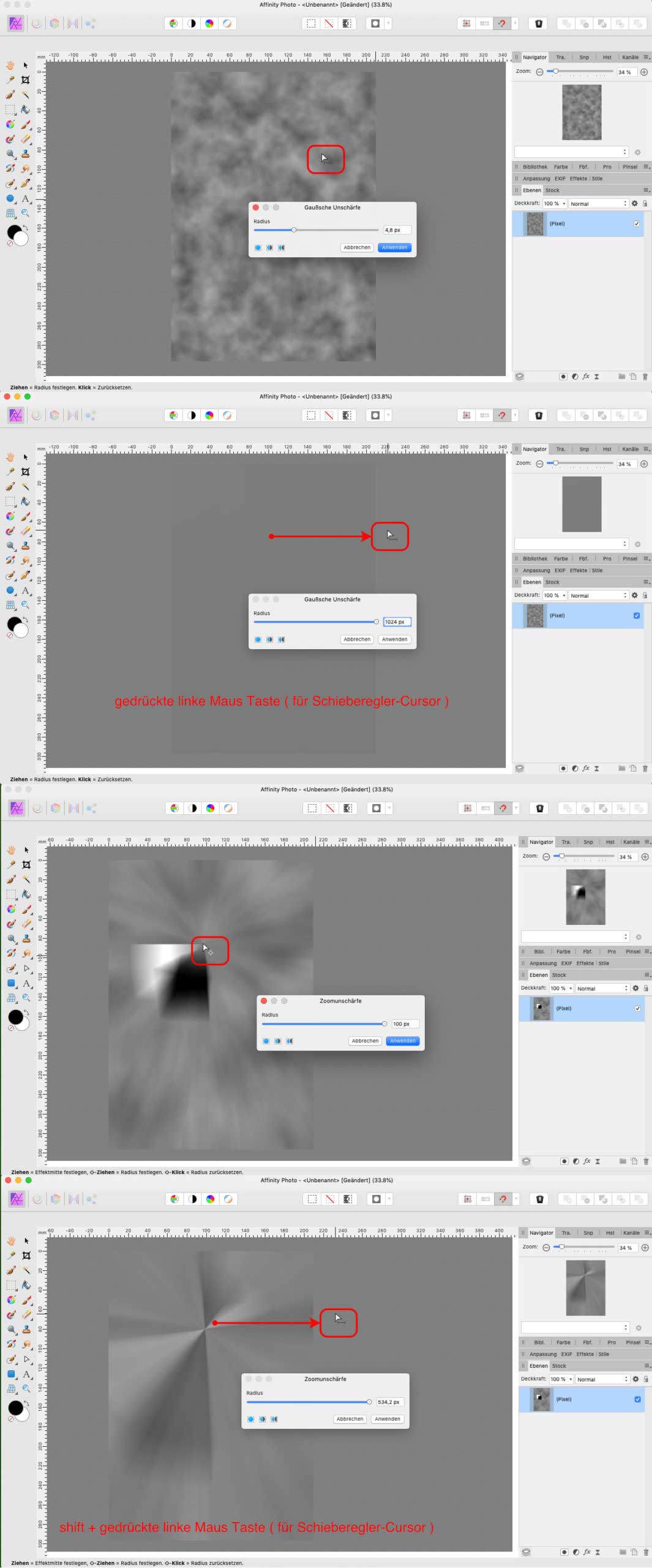 In Affinity Photo funktioniert das bei vielen Filtern – und Ihr könnt so auch den maximalen Radius-Wert erreichen. Am besten also direkt nach dem Aufruf eines (Live-) Filters den Schieberegler vergessen und direkt ins Bild klicken und ziehen. Mit einem Doppelklick setzt Ihr den gewählten Radius schnell auf Null zurück.
