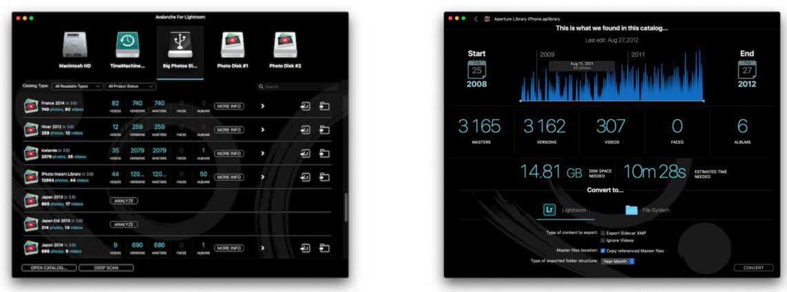 Der größte Schatz eines Fotografen sind seine Fotos – zum einen der Bestand im Originalformat (meist JPEG oder Raw), zum anderen die bearbeiteten Ergebnisse und Varianten. Die Mac-Software Avalanche des Herstellers Cyme verspricht, Lightroom-, Aperture-, Apple Fotos- und (demnächst) Capture One-Kataloge vollständig und ohne Datenverlust in Luminar- oder Lightroom Classic-Kataloge umzuwandeln. Ein Konzept mit Zukunft? Und Herstellerunabhängigkeit durch Künstliche Intelligenz?