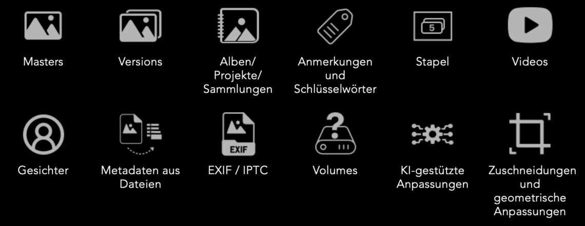 Darüber hinaus werden auch Versionen, Sammlungen, Schlüsselwörter und Anmerkungen, Stapel, erkannte Gesichter und weitere Metadaten bewahrt: