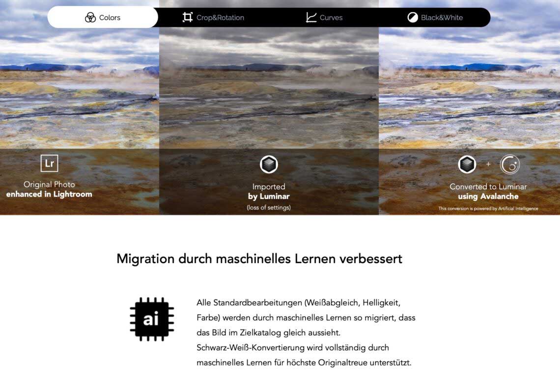Laut Avalanche-Hersteller soll das Bildergebnis nach der Migration in den Luminar-Katalog genauso aussehen wie das entwickelte Bild in Aperture, Lightroom Classic, (demnächst) Capture One und in Apples Fotos-App. Selbst die Konvertierung eines Luminar 4-Katalogs in einen Luminar-AI-Katalog geht mit Avalanche. Man sollte meinen, das wäre unnötig, aber Luminar kennt zum Beispiel keine Ebenen mehr, so dass das mehrfache Anwenden von Effekten wie etwa Sonnenstrahlen oder Augmented-Sky-Objekten in Luminar AI nur noch über aufwändige Umwege möglich ist.
