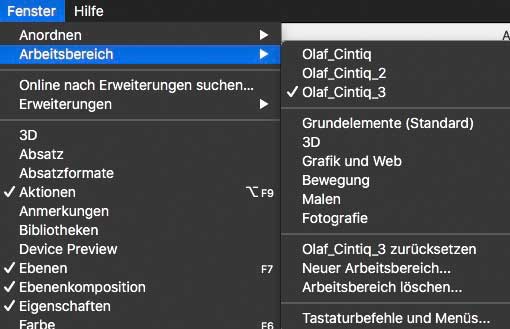 Die vorgefertigten sowie die eigenen Arbeitsbereiche finden Sie unter »Fenster > Arbeitsbereiche«.