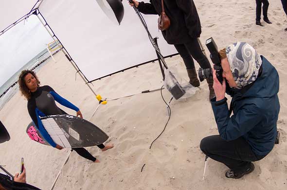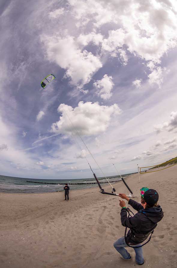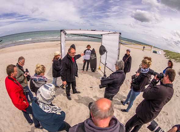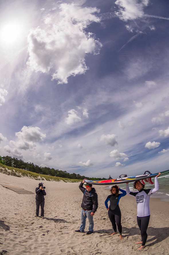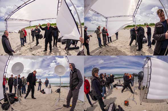 Am Montag gab Christoph Künne seinen Workshop „Das inszenierte Portrait“. Der hierbei eingesetzte Cage hatte sich schon in früheren Jahren in Zingst bewährt, aber es ist immer wieder eine Herausforderung, ihn stabil zu verankern. So mussten die Surfer am Strandübergang 6, die sich als Models zur Verfügung gestellt hatten, zunächst noch etwas warten. Mein Fisheye erwies sich als ideal, um die Vorbereitungen wie auch den Workshop selbst zu dokumentieren.