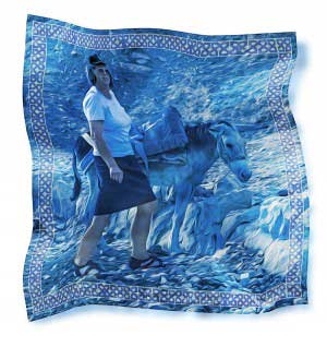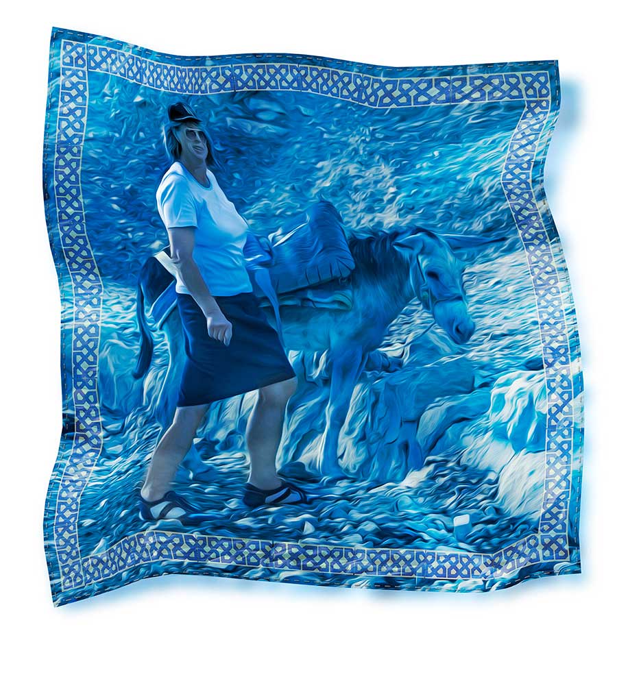 Das Seidentuch unten wurde zunächst farblich modifiziert und mit Photoshops „Ölfarbe“-Filter bearbeitet, dann mit einem Ornamentrahmen ergänzt. Für ein solches Seidentuch 90 x 90 cm zahlen Sie etwa 130 Euro, für einen Baumwoll-Seide-Schal 200 x 70 cm 86 Euro. An den Druckergebnissen unserer Testschals gab es hinsichtlich Farb- und Detailtreue nichts auszusetzen.