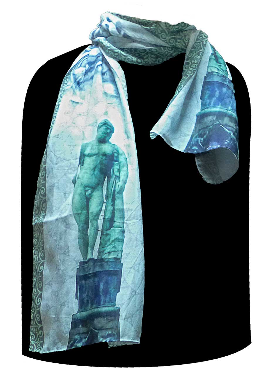 Oben sehen Sie den Entwurf für einen Baumwoll-Seide-Schal (genauer: etwa ein Drittel seiner Länge) mit Herkules-Motiven, unten das gedruckte Ergebnis.