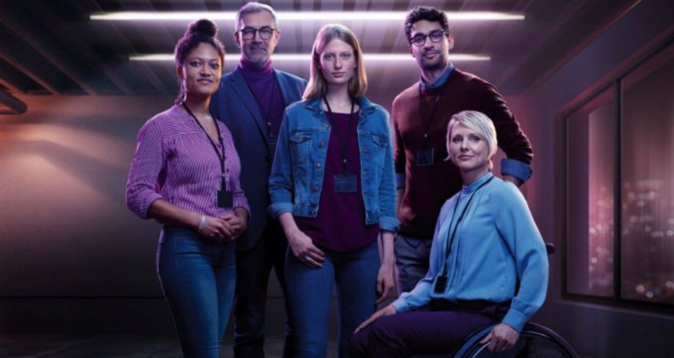 Die personelle Choreografie des Kampagnenmotivs folgt so offensichtlich einer Checkliste für politisch korrekte Gruppenporträts, dass es schmerzt. Im Zentrum steht, leicht nach vorne gerückt, die junge weibliche Identifikationsfigur in der unvermeidlichen Jeansjacke. Ihr Blick soll wohl eine Mischung aus jugendlicher Skepsis und aufkeimendem Tatendrang signalisieren, wirkt aber eher verloren. Flankiert wird sie von einem Ensemble, das direkt aus dem Casting-Bogen einer öffentlich-rechtlichen Vorabendserie zu stammen scheint. Links die engagierte Kollegin mit modischem Dutt und sichtbarem Migrationshintergrund. Dahinter der erfahrene Silberrücken im Rollkragenpullover, der mit väterlicher Strenge für Seriosität bürgen soll. Rechts der adrette Technik-Spezialist mit Dreitagebart südländischen Typs und davor die souveräne Führungskraft im Rollstuhl. Jeder Blick ist präzise auf einen unsichtbaren Fluchtpunkt jenseits des Betrachters gerichtet, die Arme sind mehrheitlich verschränkt – die universelle, aber leider auch abgedroschene Geste für „Wir meinen es ernst und sind ein unschlagbares Team“. Diese aufgesetzte Pose der Unnahbarkeit und Professionalität ist derart überzeichnet, dass sie unfreiwillig ins Komische kippt. Es wirkt wie der verzweifelte Versuch, eine komplexe Organisation auf ein simples, visuelles Klischee zu reduzieren.