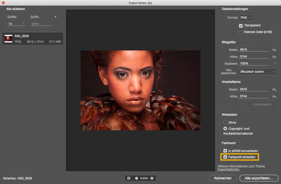 "Exportieren als" und der Quickexport haben noch einen weiten Weg vor sich, bis sie »Speichern für Web« ersetzen können. Zumindest kann man jetzt das Profil einbetten lassen. Die Vorschau ist nach wie vor nicht farbgemanaged.