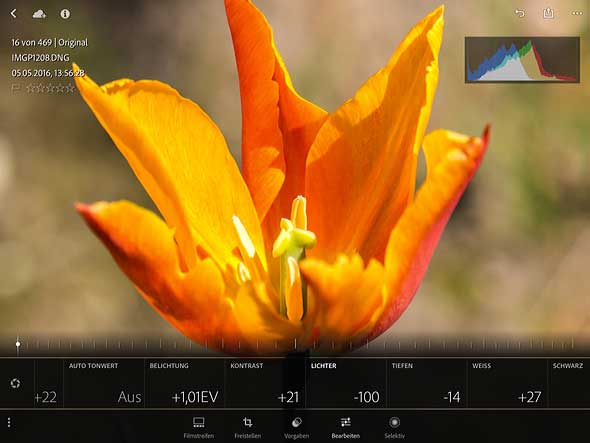 Bedenkt man, dass PhotoRaw nur einen einzigen Entwickler hat, sind die damit erzielbaren Ergebnisse beachtlich; mich störte allerdings, dass die Lichterrettung in überbelichteten Bildbereichen unbefriedigend blieb. Adobes Lightroom mobile hingegen liefert hier die Qualität, die ich von der Desktop-Version gewohnt bin, auch wenn man auf viele Regler und Features verzichten muss. Lightroom mobile ist auch nicht darauf beschränkt, die gewählten Entwicklungseinstellungen über die Cloud mit der Desktop-Anwendung zu synchronisieren, sondern kann die Raw-Daten auch auf dem iOS-Gerät entwickeln und im JPEG-Format sichern. Mit dieser Kombination von Hard- und Software kann ich also sinnvoll mit den Raw-Dateien arbeiten, auch wenn ich mein MacBook Air einmal nicht dabei habe.