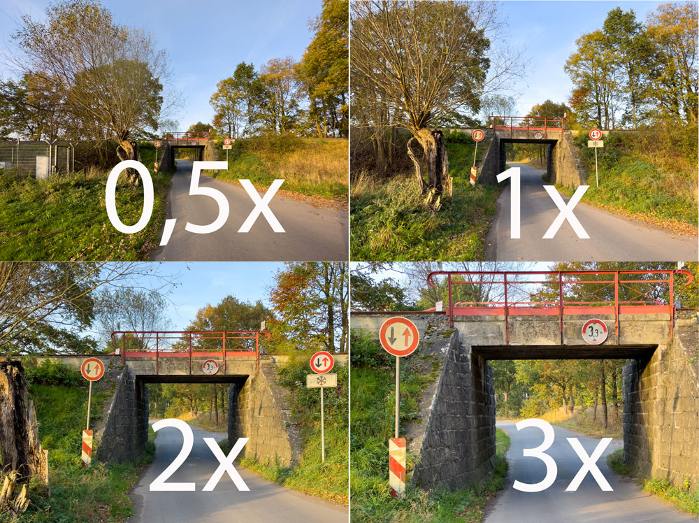 Durch einen Kunstgriff bietet Apple nun als Basis vier Brenweiten (0,5x, 1x, 2x und 3x) an. Bei der 2x Brennweite, analog zu 48 Millimeter, wird der Bildsausschnitt des 24er-Weitwinkels einfach nur auf die Bildmitte beschnitten, so dass (im Raw) eine 24 Megapixel-Auflösung übrig bleibt.