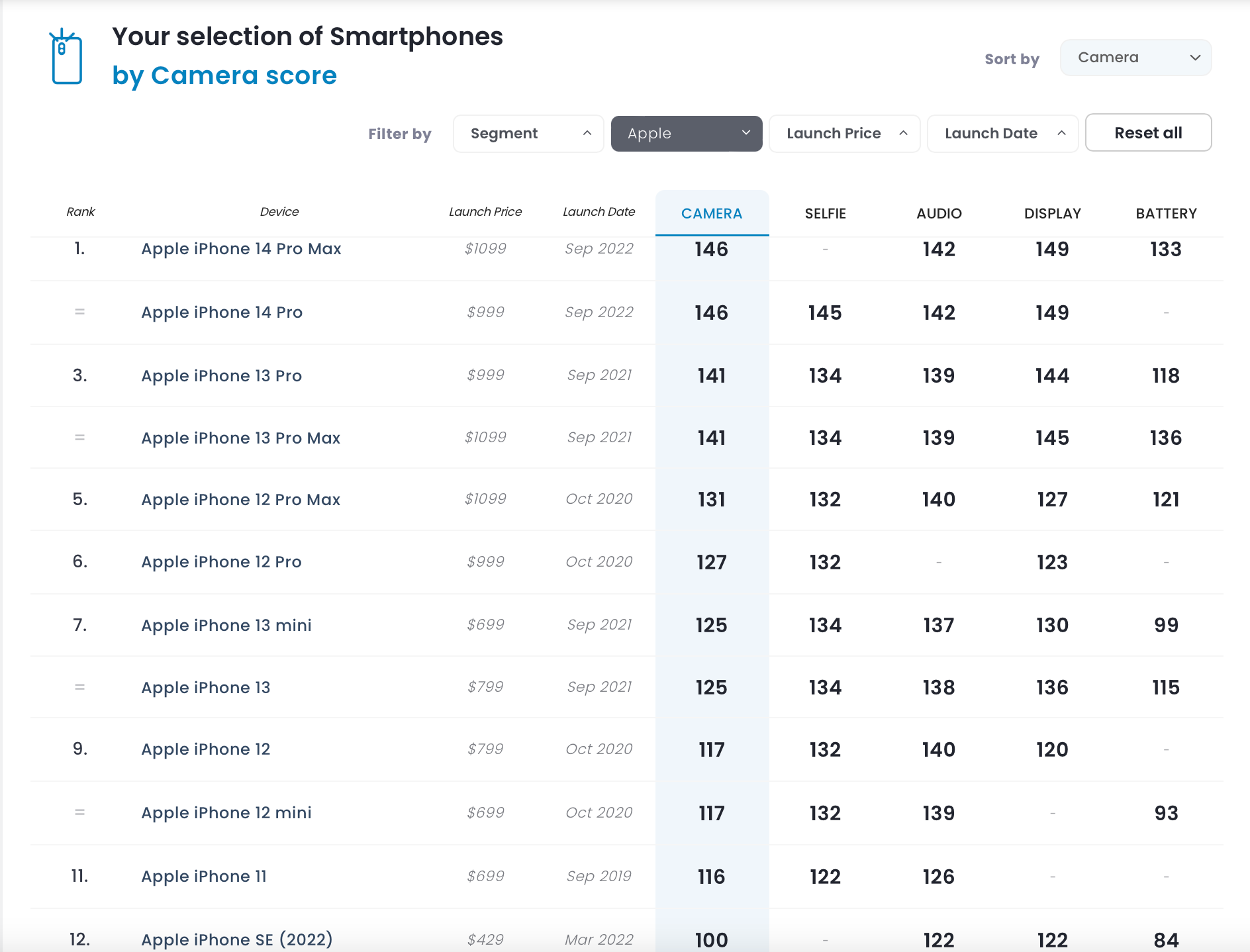 Um der Frage nachzugehen, ob sich ein Neukauf für Fotografen wirklich lohnt, sollte man zunächst zwei Ansätze trennen: Labortests und Realwelt-Tests. Wer der Objektivität und der Vergleichbarkeit von Prüfungen mit optischen Messverfahren den Vorzug gibt, findet bei DXO eine Übersicht über alle Apple-iPhones der letzten Jahre und die Leistungswerte der Mittbewerber. Hier ein Auszug: