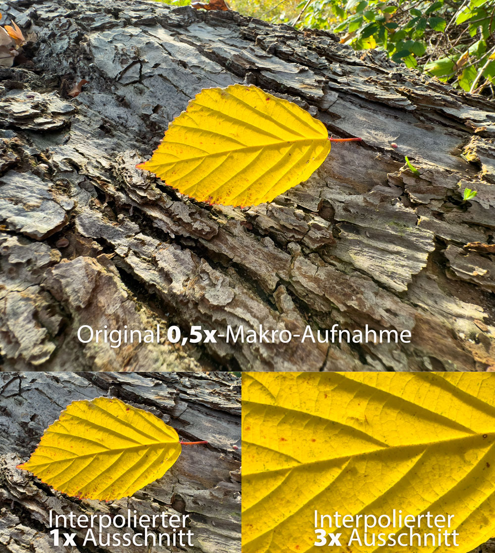 Wer es bis an die Grenze von etwa zwei Zentimeter Aufnahmeabstand nutzt, läuft in den meisten Lichtsituationen Gefahr, so nah ans Motiv zu kommen, dass der Schatten des Geräts das Bild teilweise oder sogar ganz abdunkelt. Außerdem treten extreme Unschärfen und Verzerrungen in den Randbereichen des Weitwinkels auf. Setzt man das Makro mit etwas mehr Abstand und einer anderen Brennweite ein, skaliert die Kamerafunktion einen Ausschnitt aus der Weitwinkelaufnahme und es kommt häufig zu unschönen Artefakten.